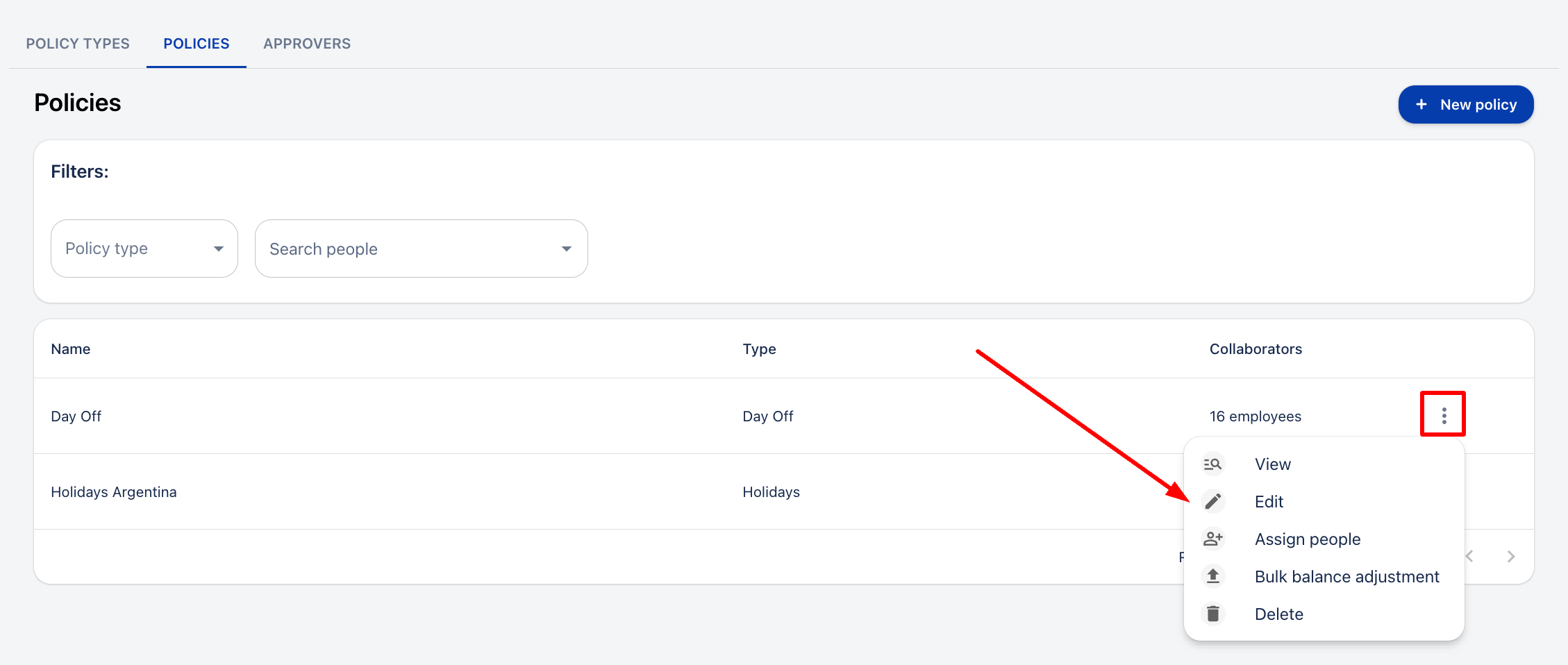 2. От секцията Отпуск отидете на конфигурацията на политиката, която искате да промените.