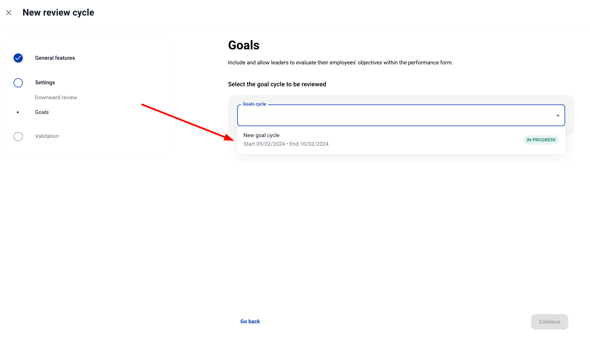 6. Избирането на шаблон с цели в конфигурацията на цикъл ще активира нова стъпка, която позволява да изберете цикъла на целите, които ще бъдат оценявани в тази оценка на представянето.