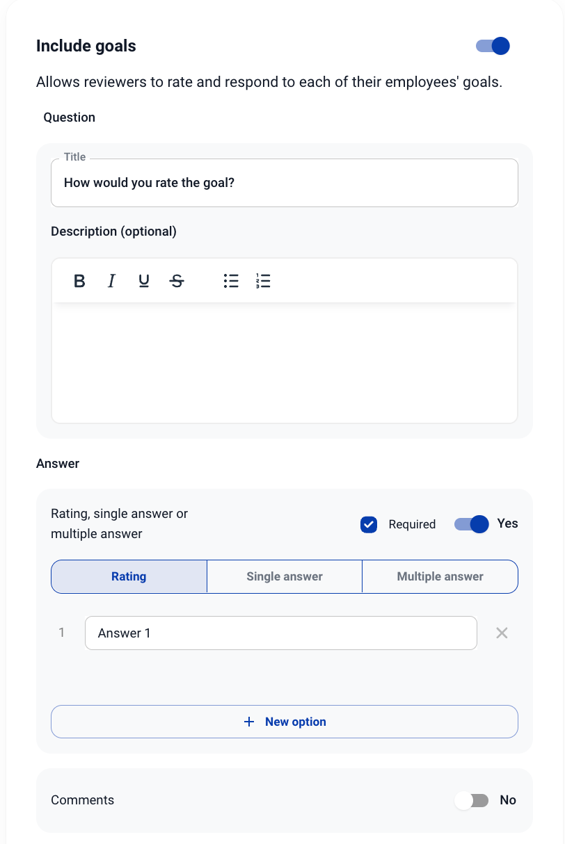 4. След като е активирано, трябва да изберете с какъв тип отговор ще се отговаря на въпросите за целите (може да бъде всеки от съществуващите типове отговори за въпросите). Всички цели ще имат един и същ тип отговор, което означава, че избраният тип отговор ще се прилага за всички цели на оценявания потребител.