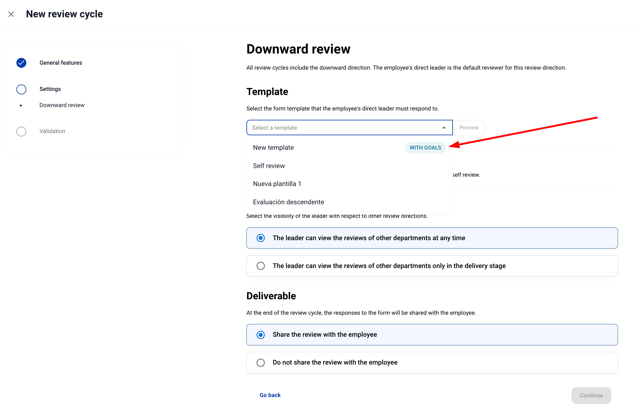 5. След като шаблонът е конфигуриран, отиваме в секцията „Review Cycles“. При създаване на нов цикъл на оценка, на етапа на избор на шаблон, ще бъдат включени тези с включени цели.