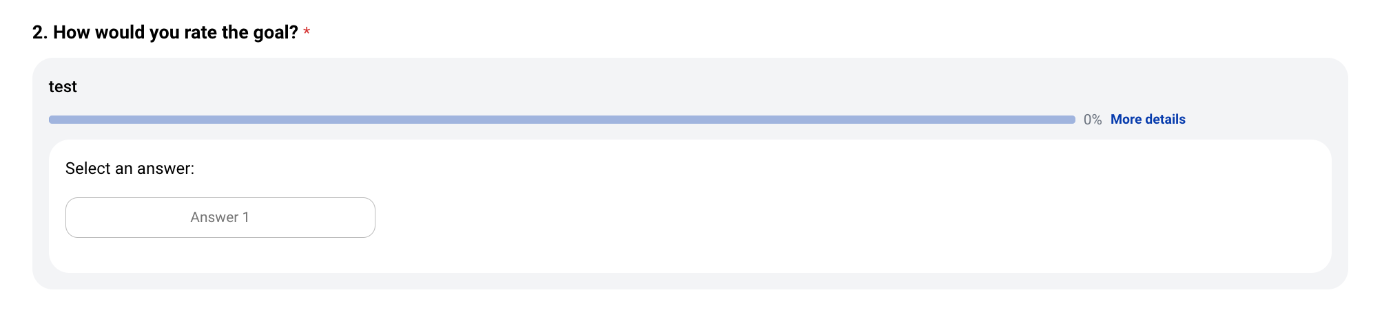 7. Когато тази опция е активна, целите на потребителя ще се показват, когато формулярът се показва за оценка. Оценителят ще види името на целта, нейния статус на напредък и ще има възможност да достъпи до екрана с подробности, за да получи повече данни, ако е необходимо за оценката.