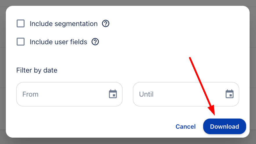 4. Можете да включите сегментации и полета на потребителите, както и да филтрирате отчета по дата. Накрая, кликнете върху Изтегляне.
