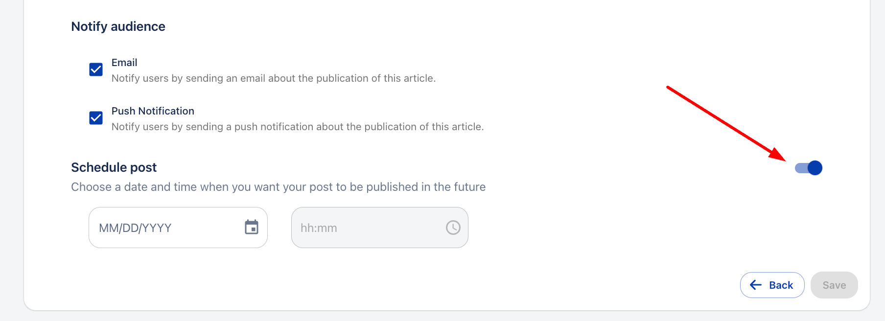 4. Веднъж в секцията за създаване на новини, в долната част, можем да активираме опцията „Планиране на публикация“.