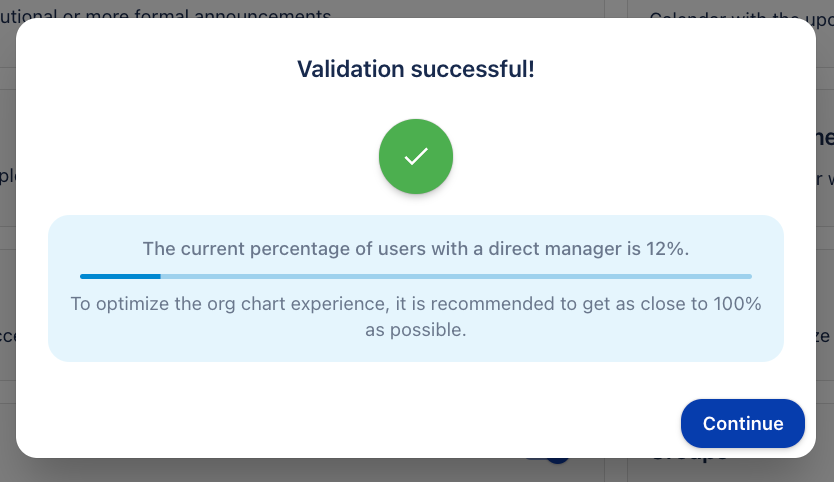 Освен това, от бутона за валидация ✅ можем да визуализираме процента на потребителите с назначен директен мениджър. За да оптимизирате изживяването с организационната диаграма, се препоръчва да се доближите възможно най-близо до 100%.