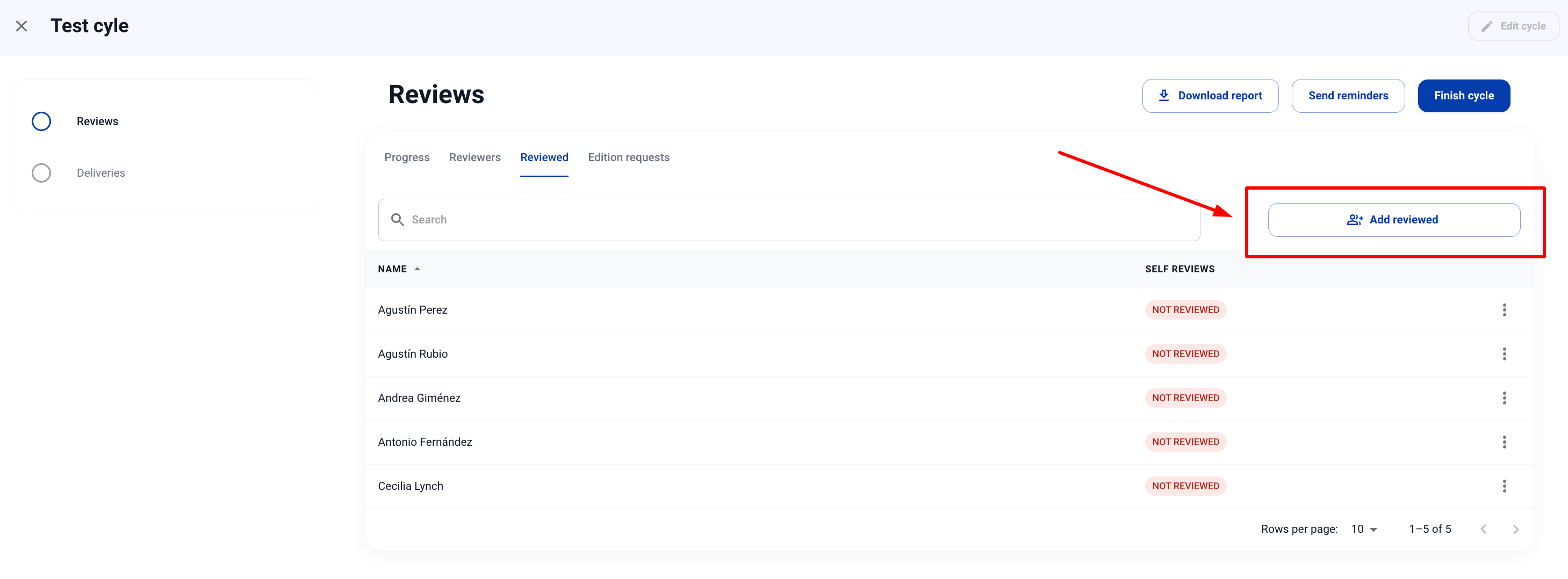 4. В секцията Evaluations > Reviewed ще се появи бутон за ръчно добавяне на нови оценявани, след като цикълът е започнал.