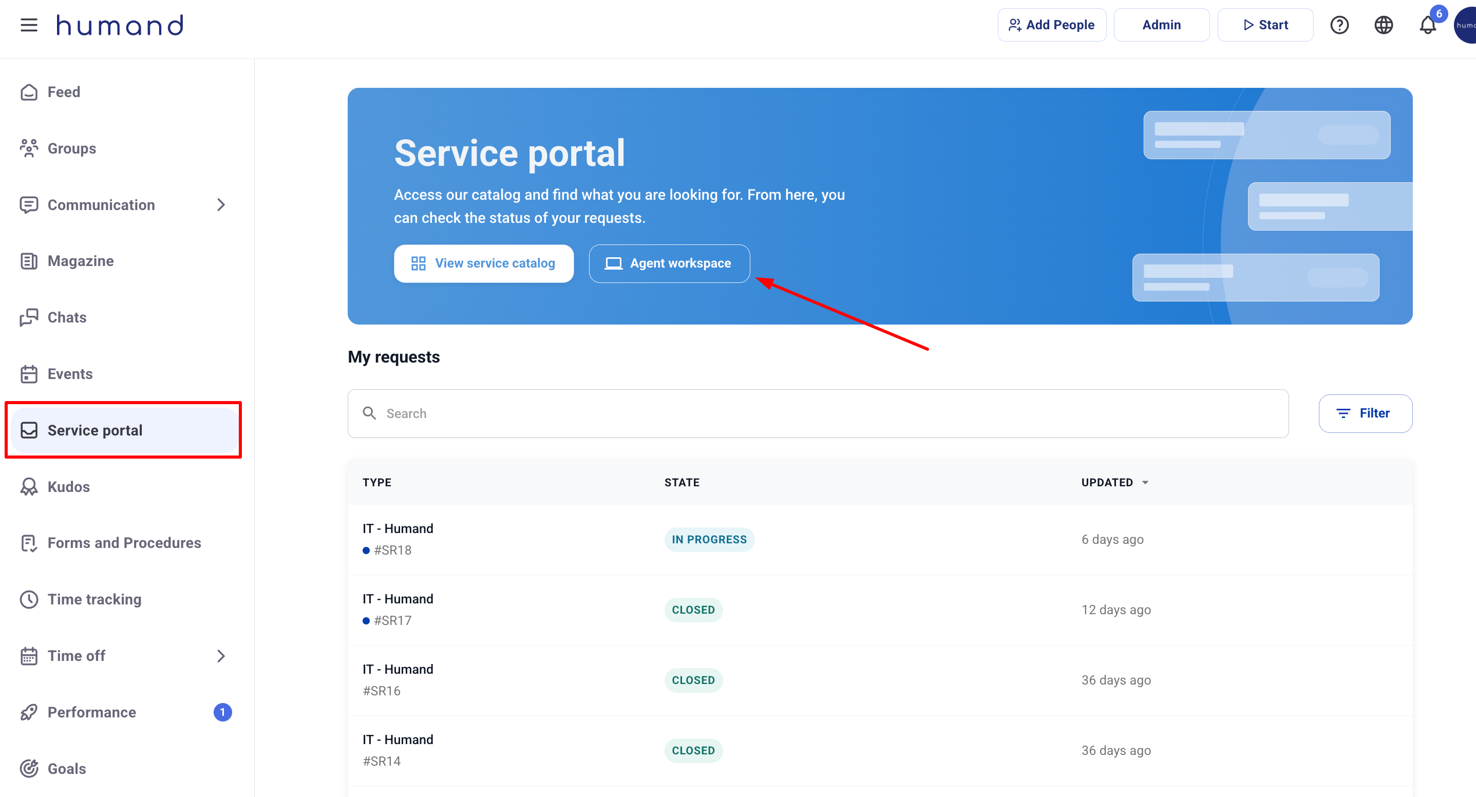 2. Отидете в секцията Портал за услуги и кликнете върху бутона „Работно пространство на агент“.3. Тук можете да видите списъка с неприсвоени заявки (за които сте кандидат) или вече присвоени заявки. Можете да търсите заявка по име или номер, или да филтрирате заявките по различни критерии.
