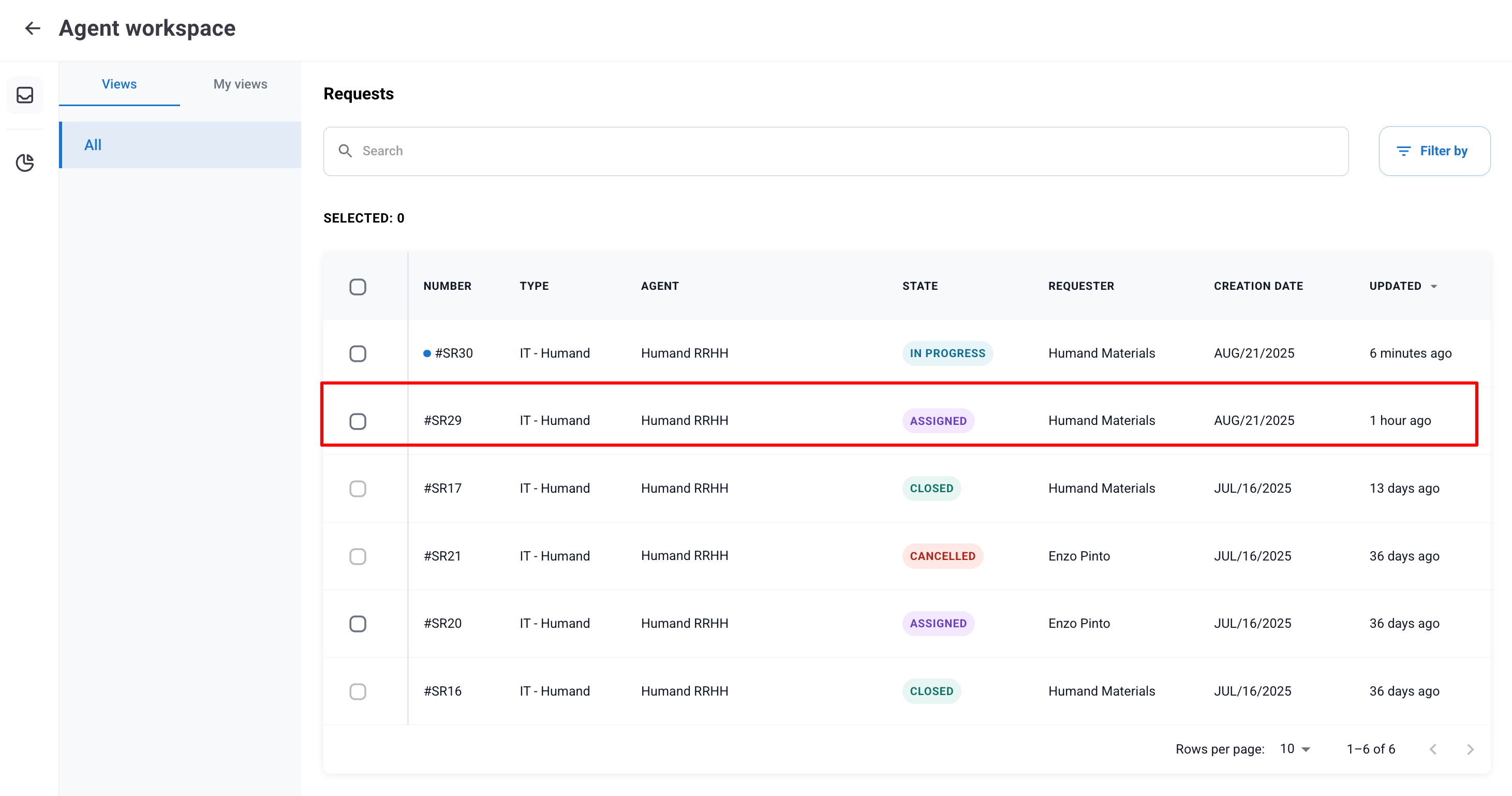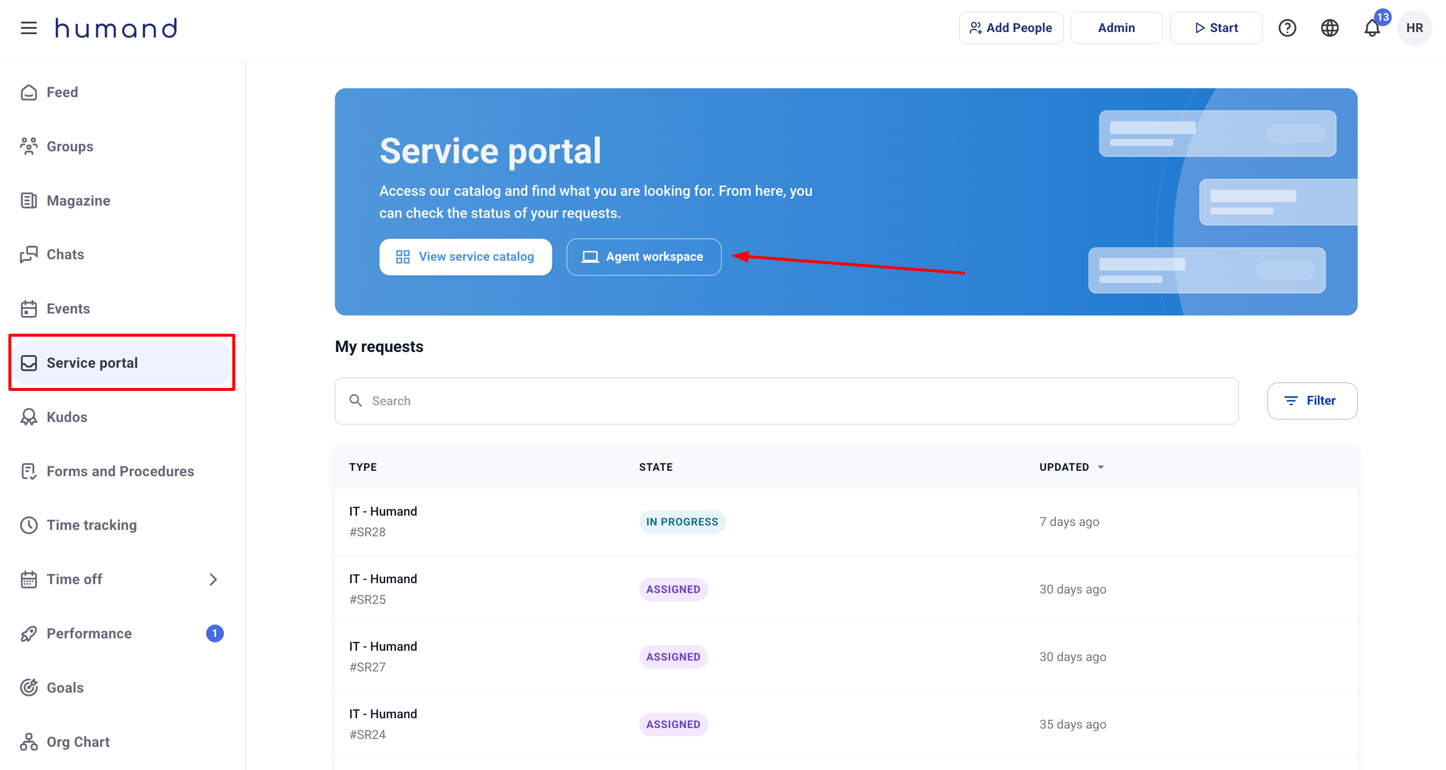 2. Отидете в секцията Service Portal и кликнете върху бутона „Agent Workspace“.3. Тук можете да видите списъка със заявки. Кликнете върху заявката, която искате да пренасочите.