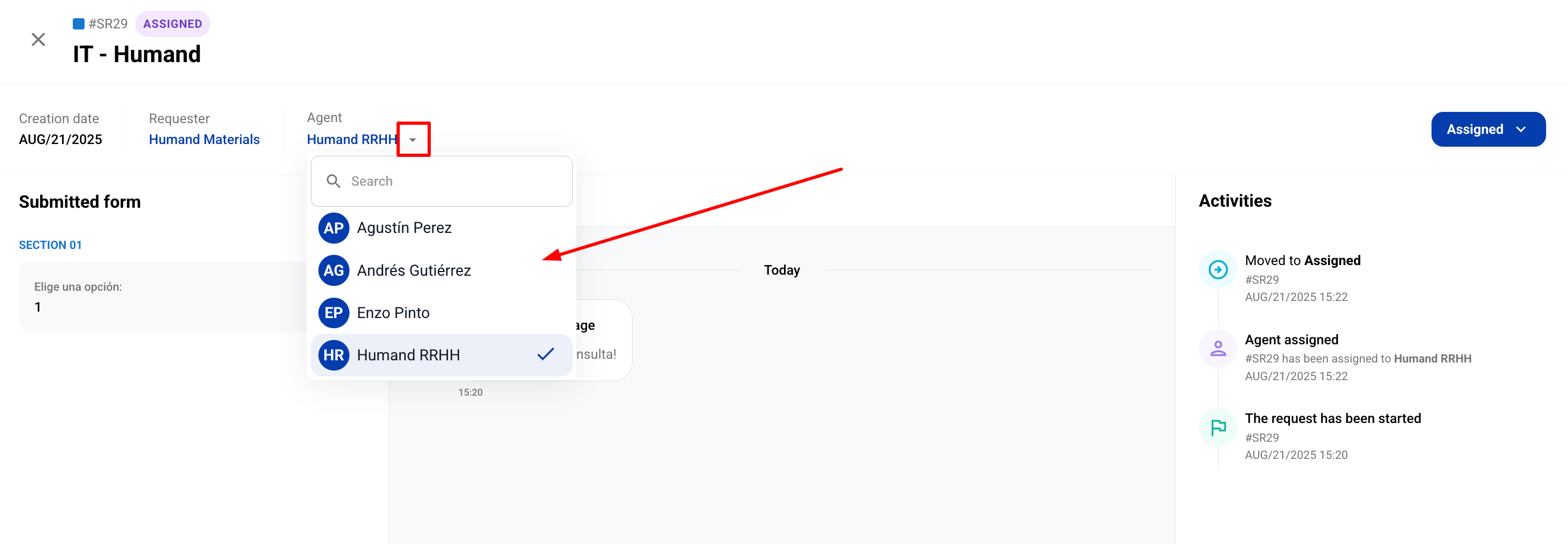 5. Веднъж вътре, кликнете върху стрелката в полето Agent, и ще се покаже списък с агенти, които в момента са на разположение за този тип услуга.