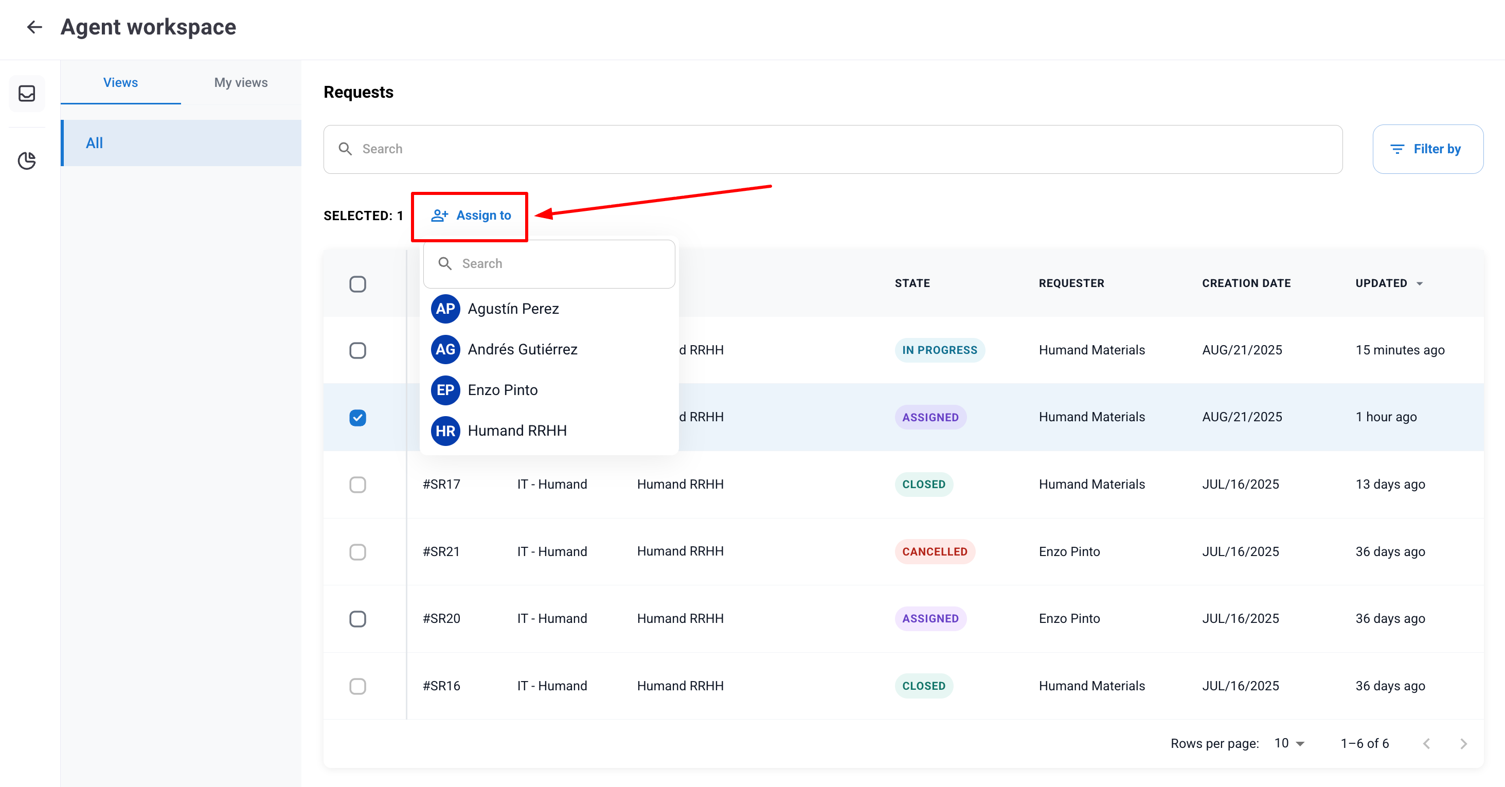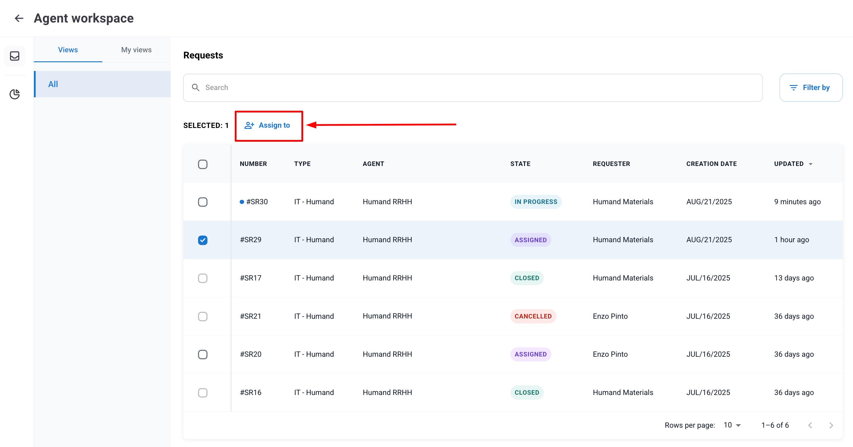 По същия начин е възможно да извършите масово пренасочване на заявки (само между заявки от същия тип услуга), като ги изберете и кликнете върху „Assign to”.