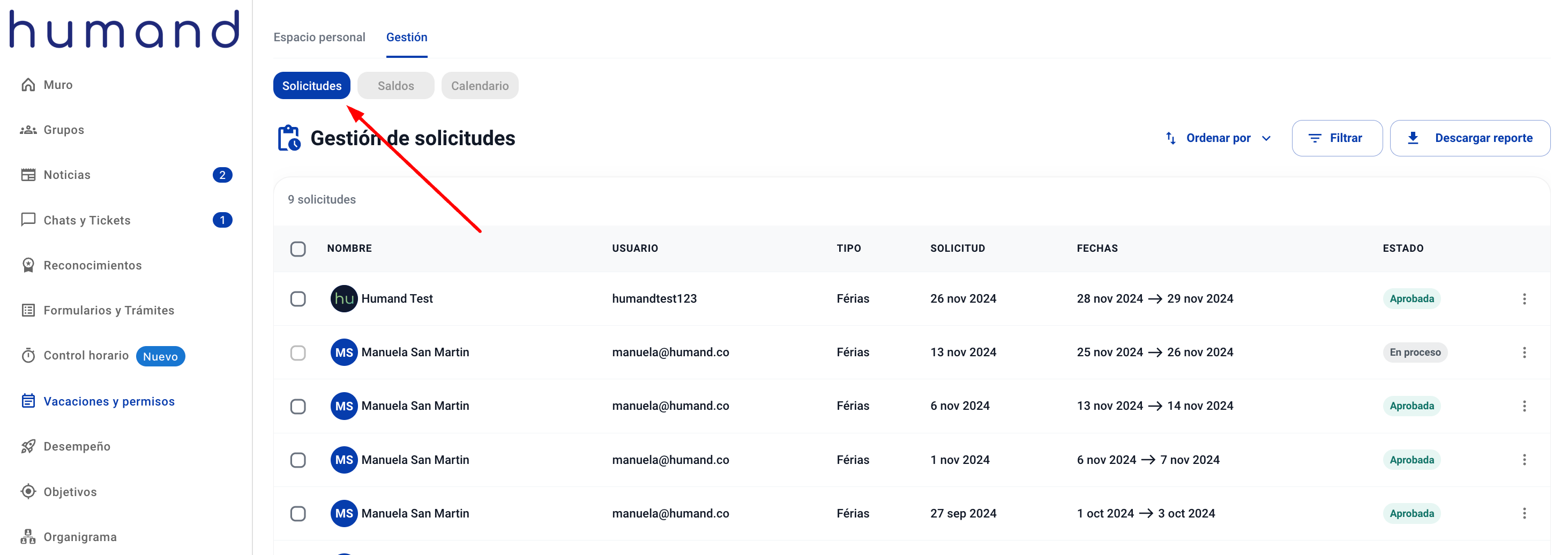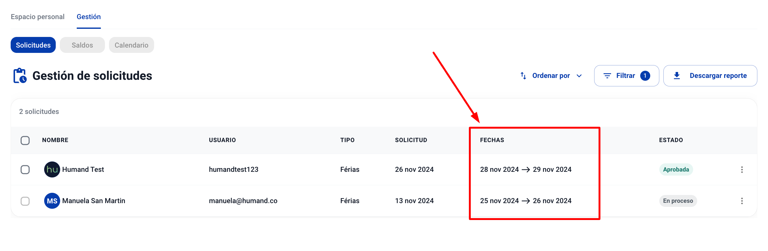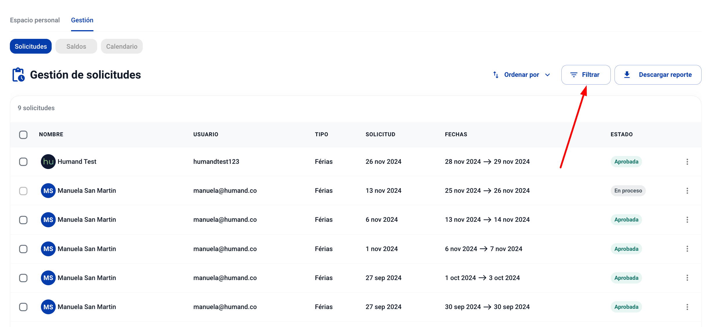 С приложението Humand можете да преглеждате и управлявате заявките на служителите. Можете също така да ги филтрирате според нуждите си, докато ги управлявате. За да ги филтрирате по период на заявката, следвайте стъпките по-долу: