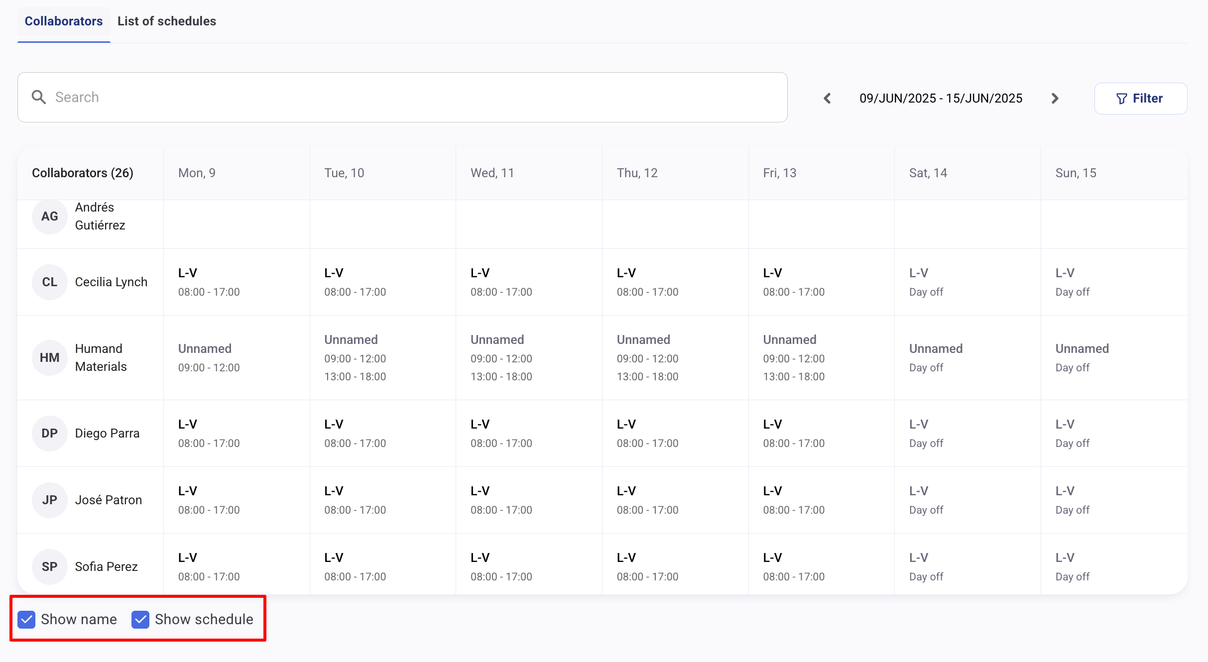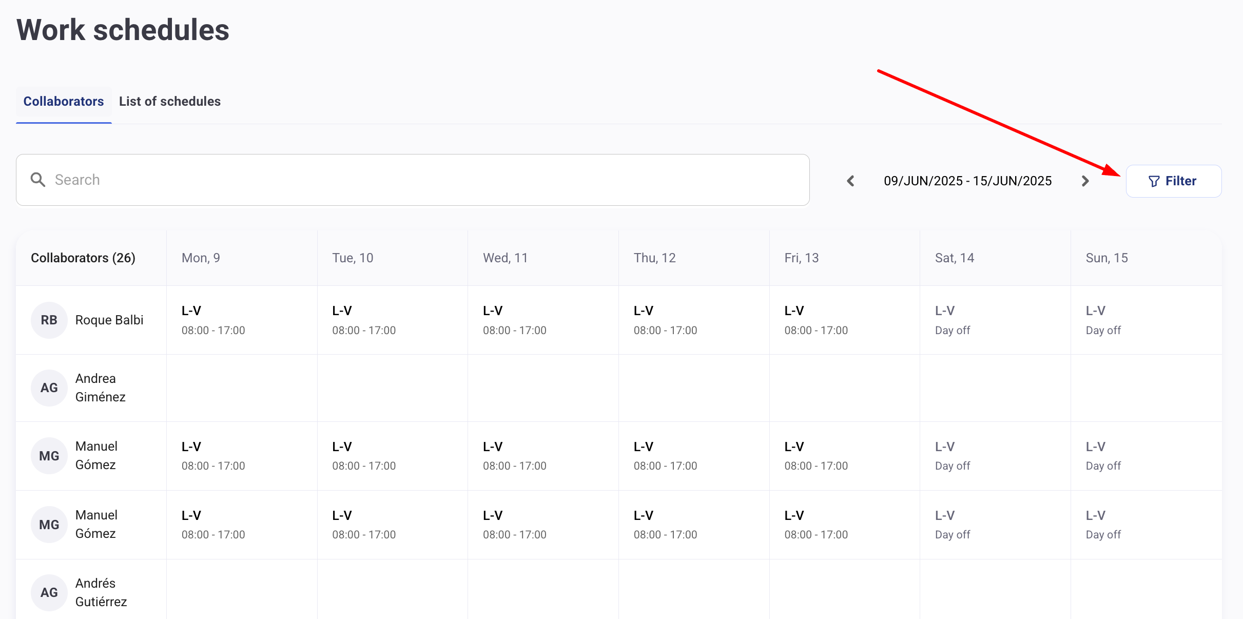 Когато влезете в секцията Работни графици, потребителите с разрешение "Управление на работни графици" могат да прегледат резултата от всички свои графици. Те ще видят календар със списък на членовете на екипа и всички графици, назначени за всяка дата.
