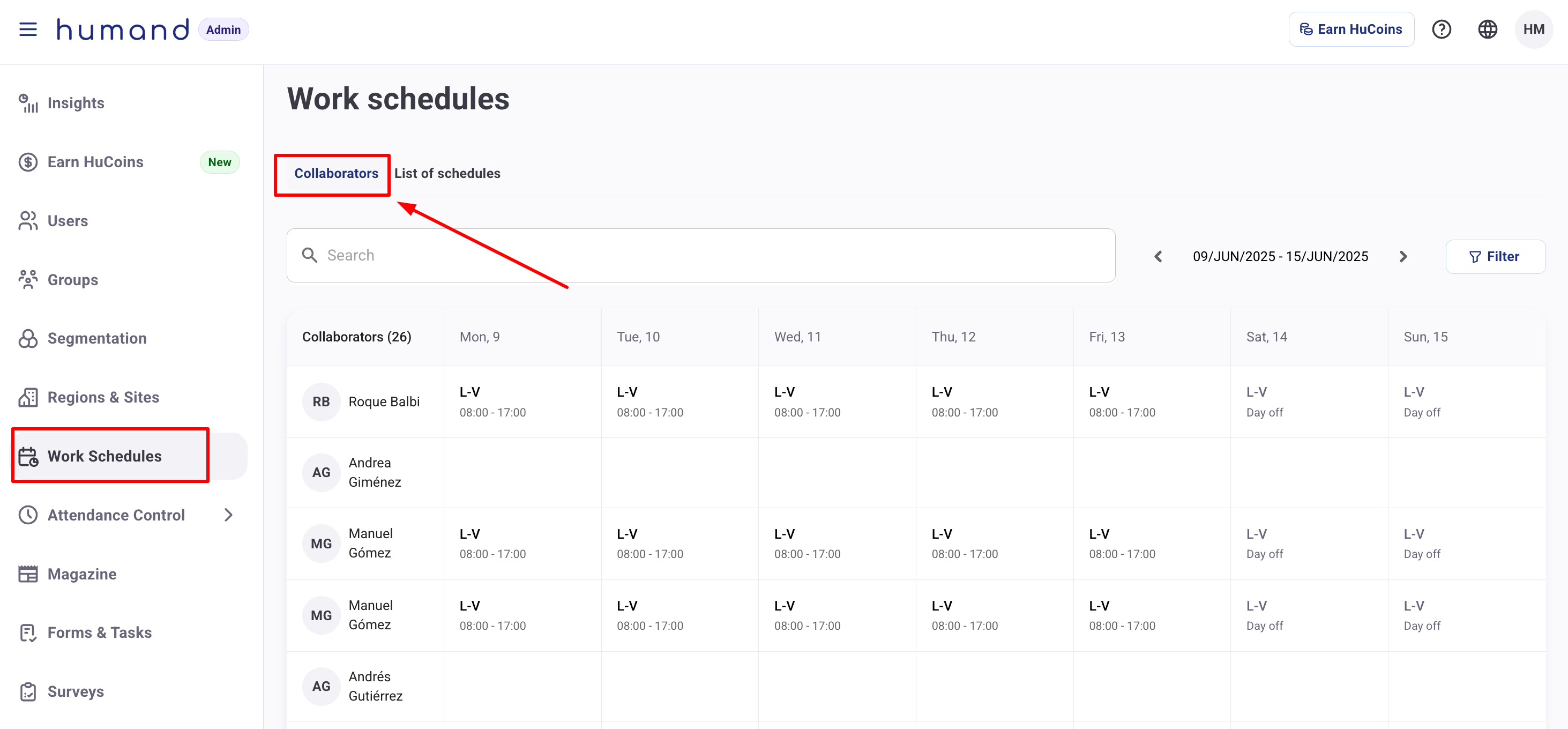 3. В таба "Сътрудници" можете да видите календар със списък на потребителите и графиците, които са им назначени.