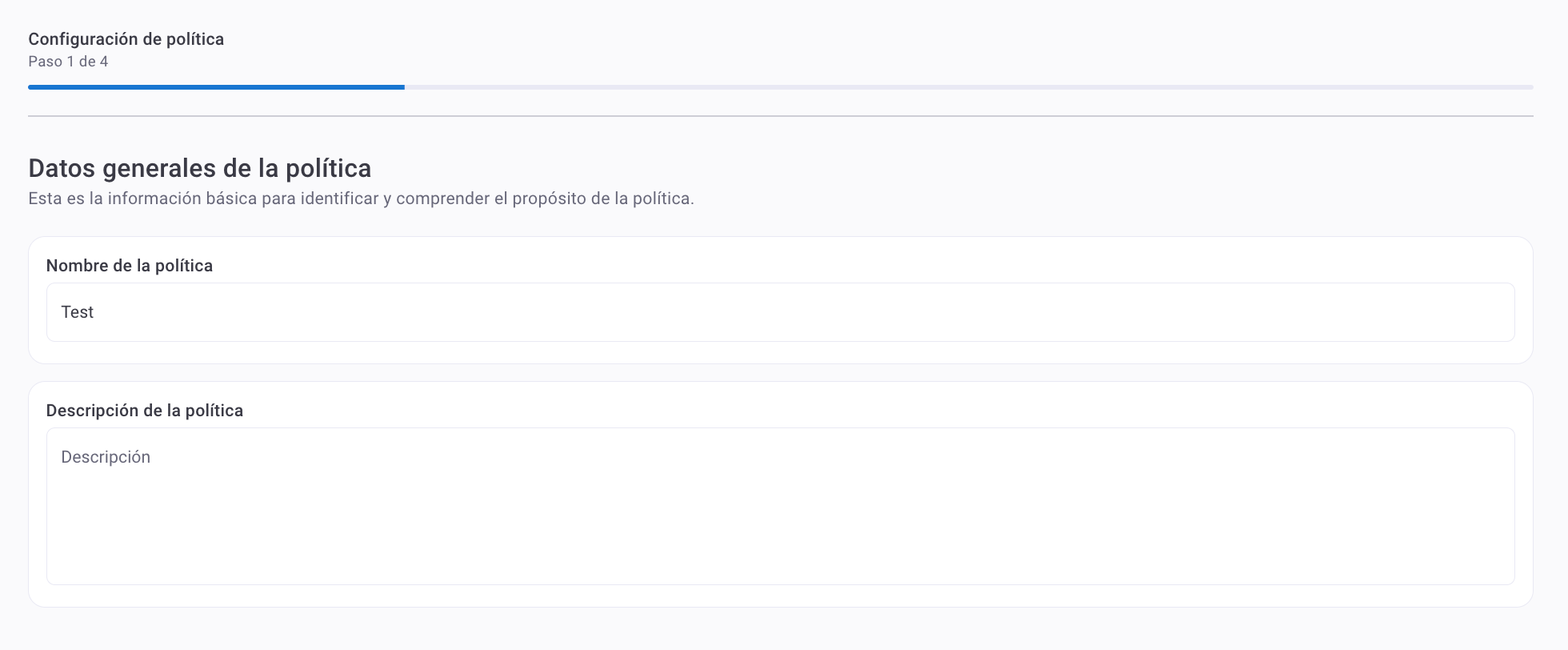 Трябва да зададете име и по желание описание. Това е основната информация, която ще ви помогне да разпознаете и разберете целта на политиката.