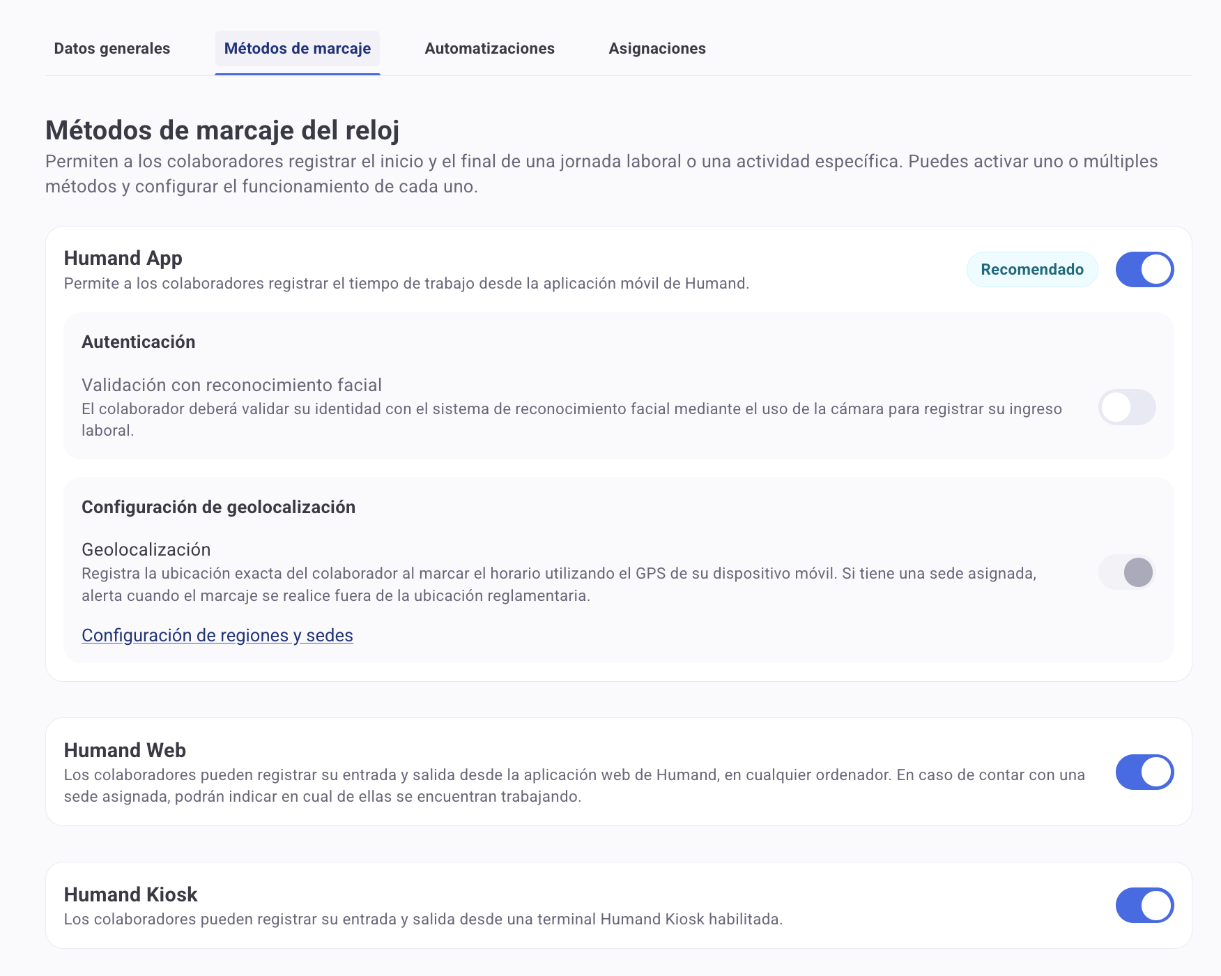 В тази секция трябва да настроите методите за отчитане на работното време, които служителите ще използват (методите ще бъдат активирани за служителите според тяхното назначение).