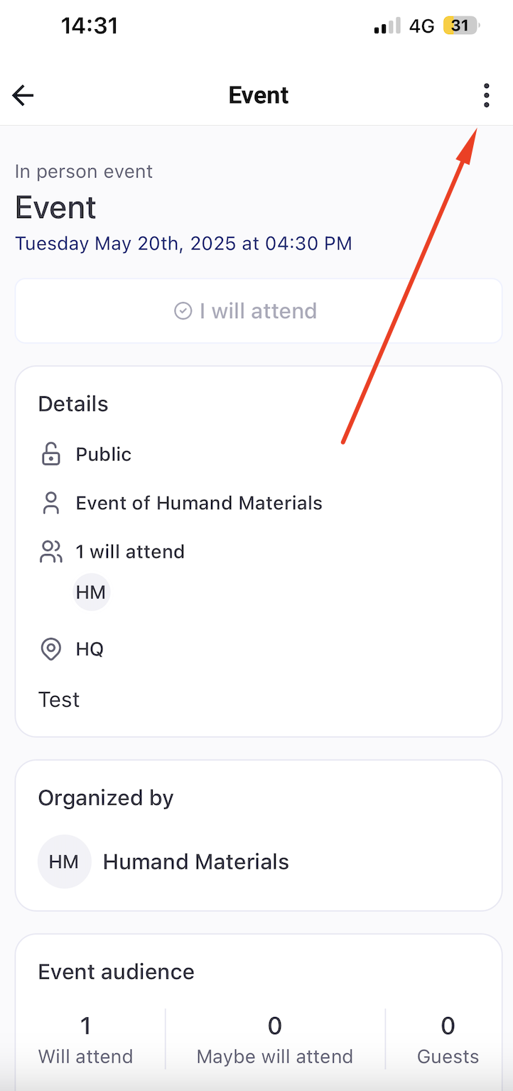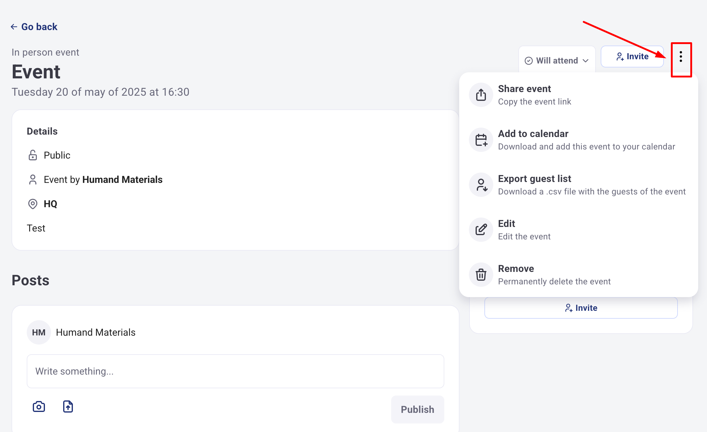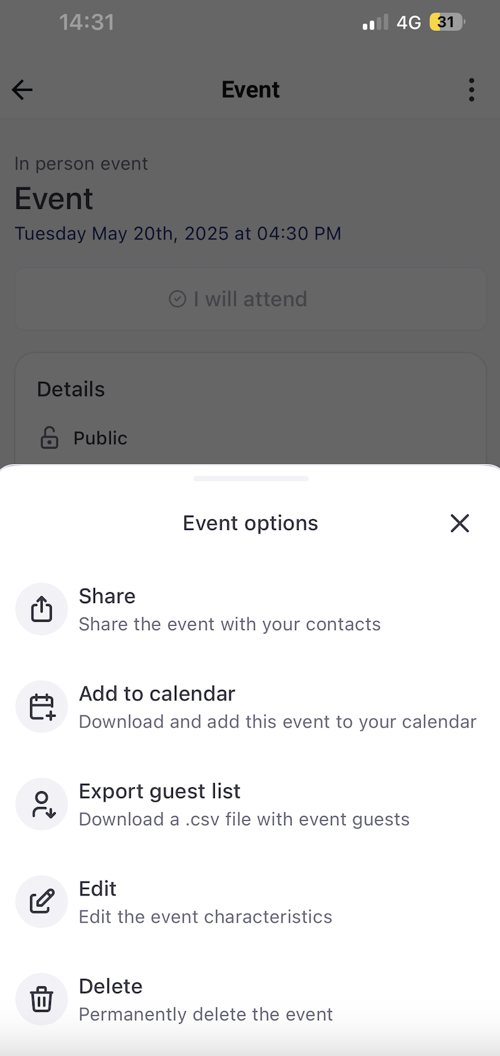6. След като събитието е създадено, ще можете да влезете в него и от трите точки можете да добавите събитието към календара си, да експортирате списъка с гости, да редактирате или изтриете събитието.