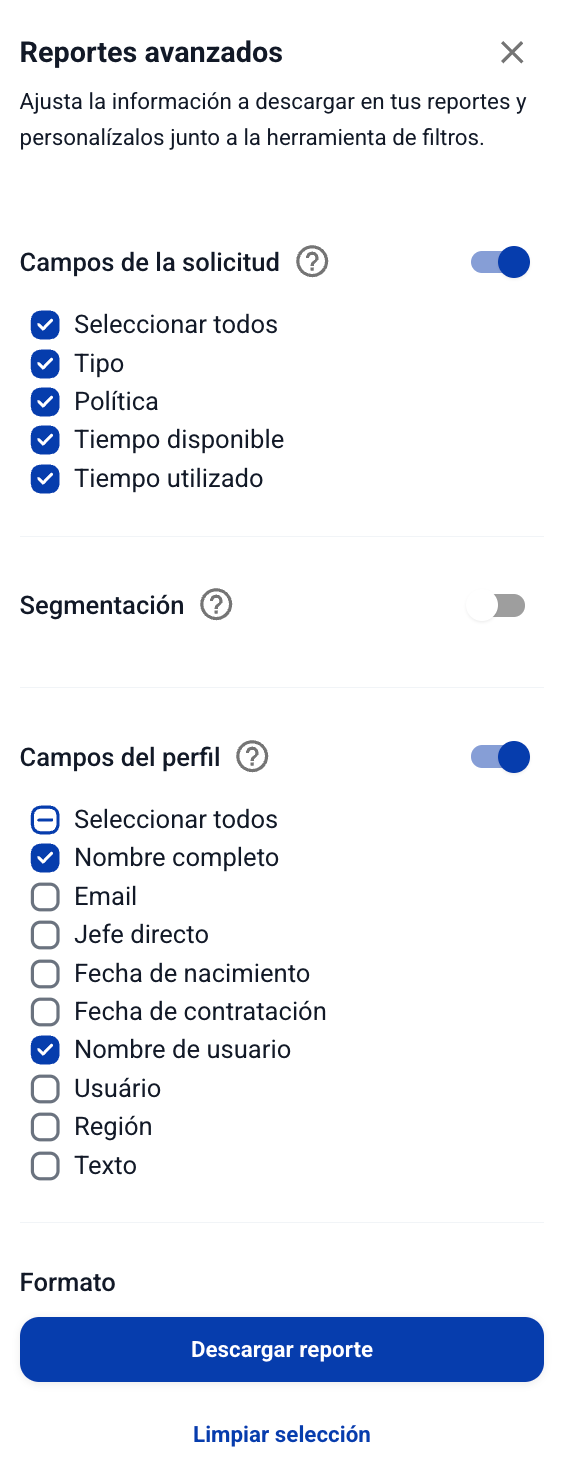 Като кликнете върху Разширени опции, можете да изтеглите справка с допълнителна информация, която сами конфигурирате, както за направените заявки, така и за да видите балансите на служителите. Информацията, която можете да добавите към справката, включва: