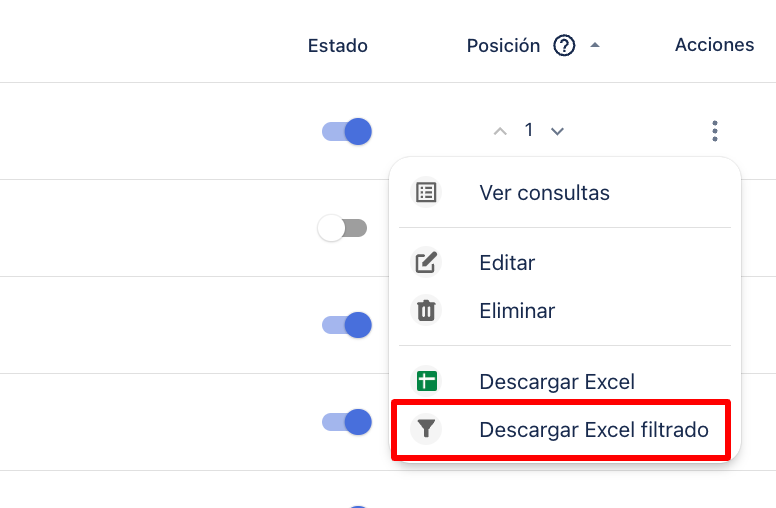 3. За да изтеглите данните за всички тикети, свързани с даден канал, кликнете върху трите точки, разположени вляво на всеки канал. След това изберете "Download Filtered Excel."