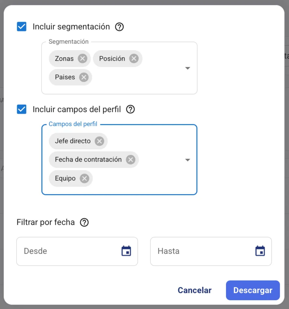 4. Там можете да изберете кои сегменти или полета от профила да включите в отчета, който ще изтеглите. Можете да добавите всичко, което ви е необходимо.