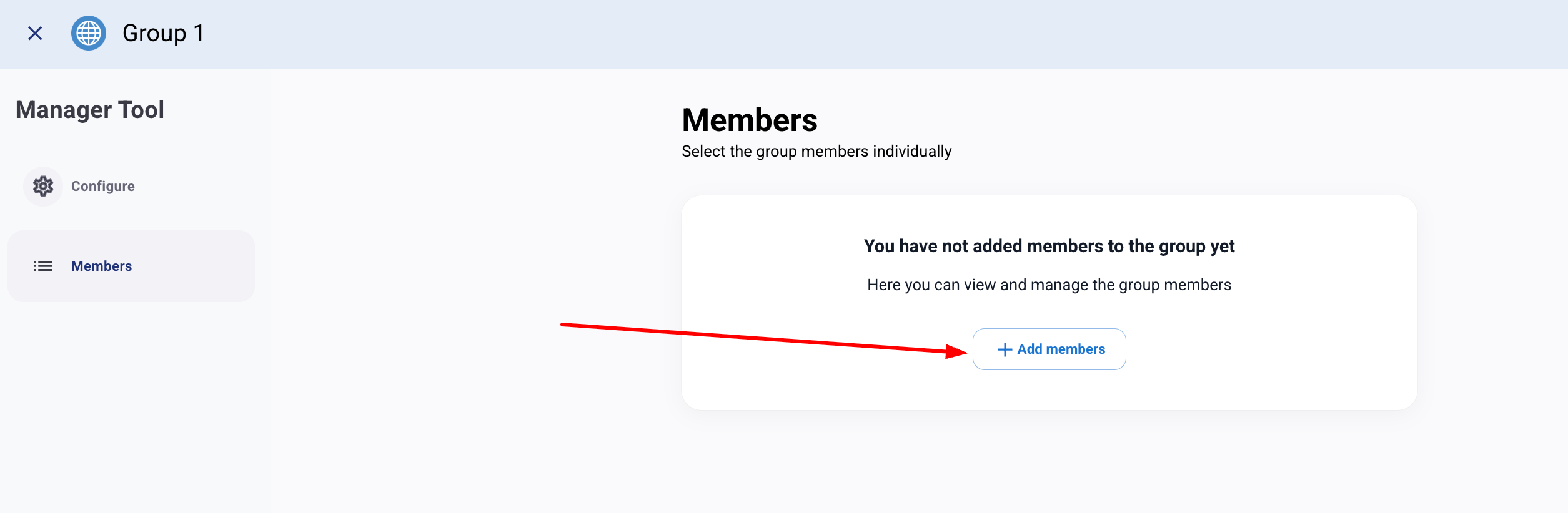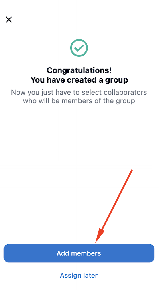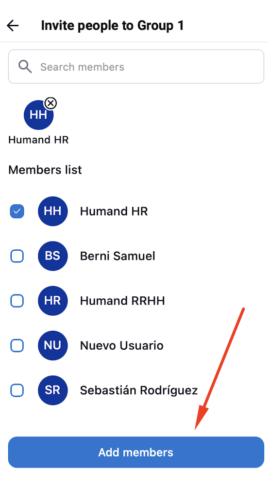 4. Накрая, можете да назначите членове на групата. Можете да изберете всички потребители или конкретни потребители, като филтрирате с помощта на сегментациите на вашата общност или ръчно търсите сътрудници. Кликнете върху бутона "Добавяне на членове".
