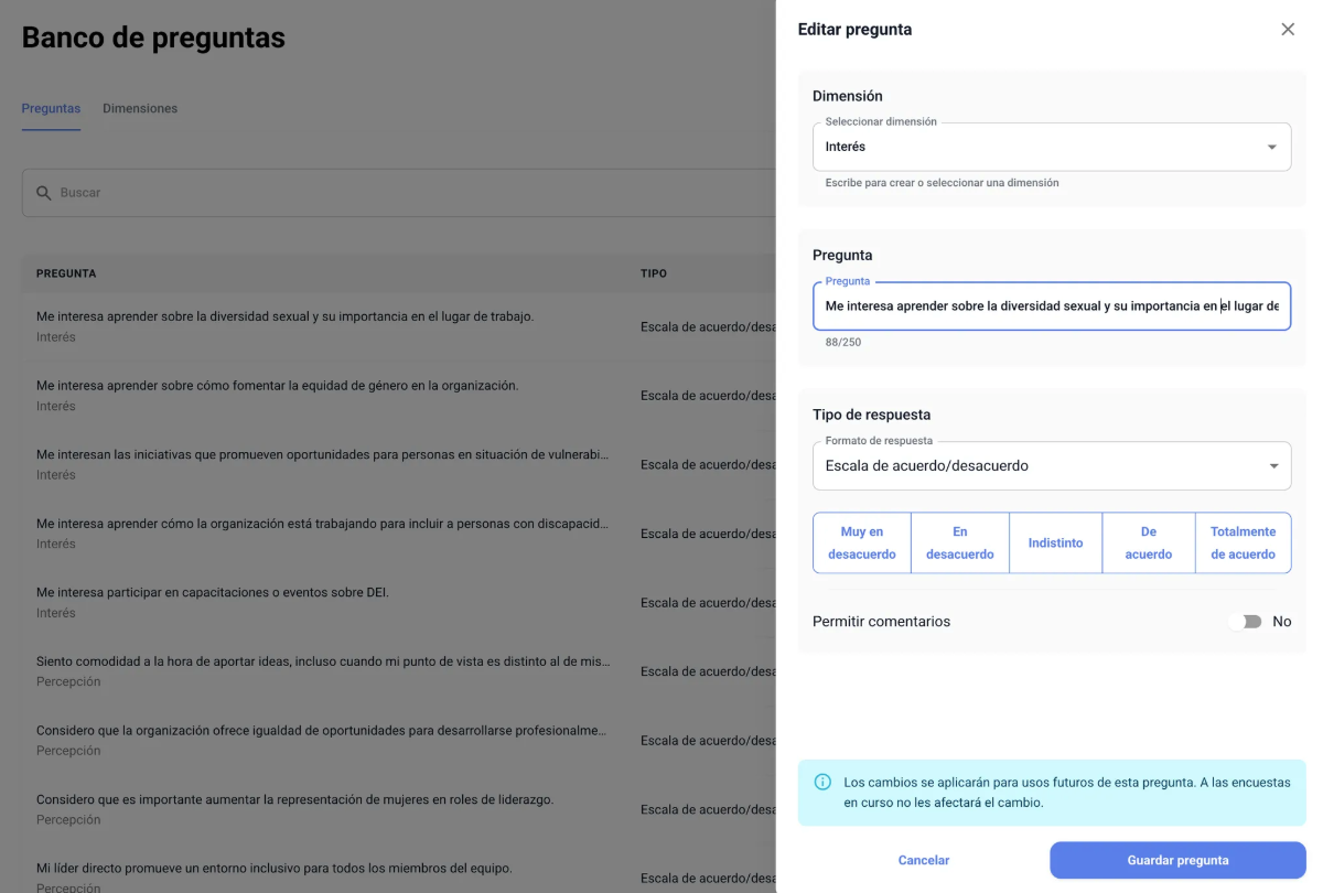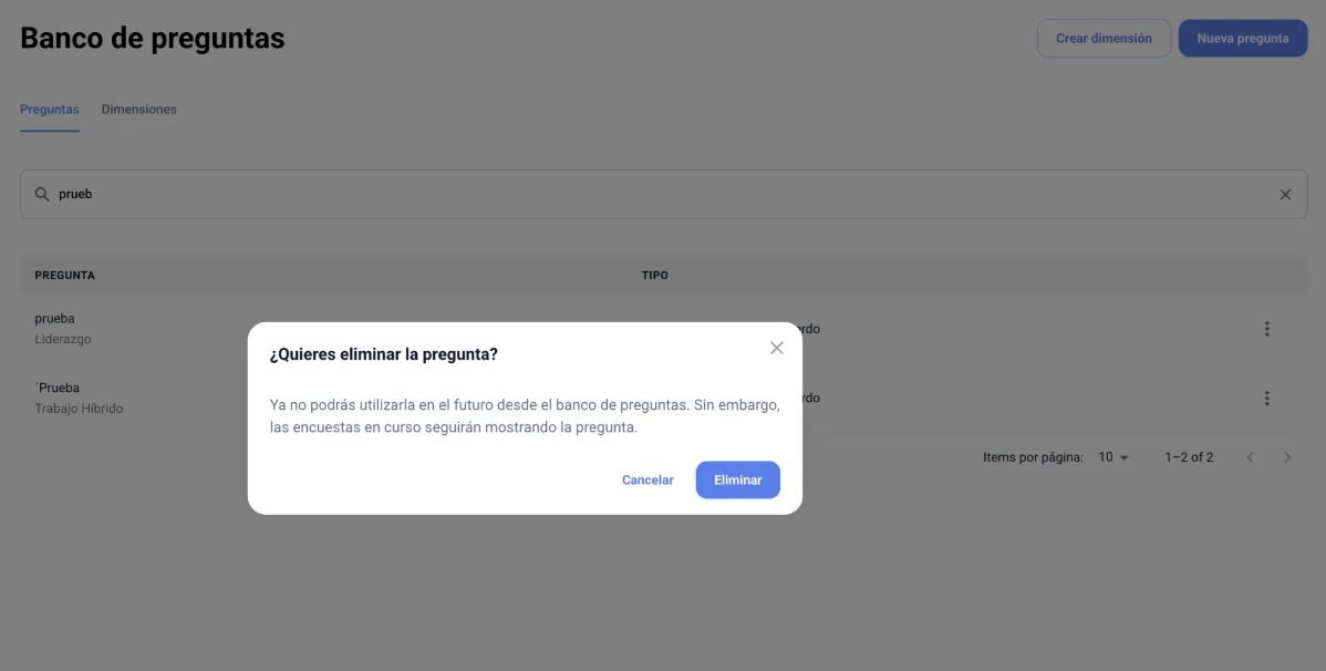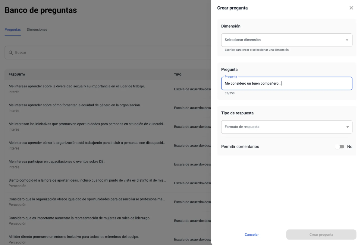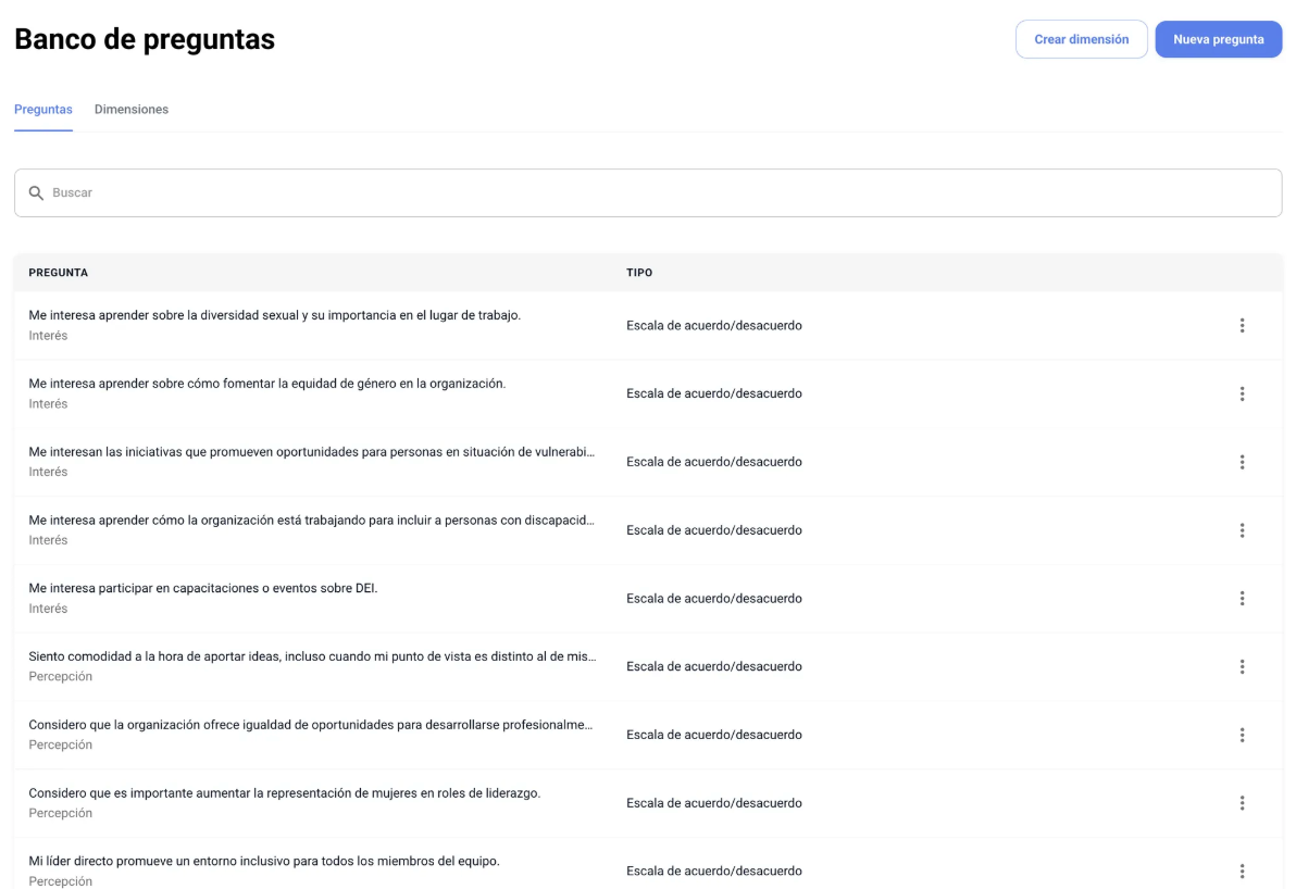 В модула ще намерите секция Банка с въпроси, където можете да видите всички създадени въпроси и измерения, както и да създавате нови, да ги редактирате или изтривате. Това е хранилище за управление на въпросите и измеренията в анкетите за People Experience.
