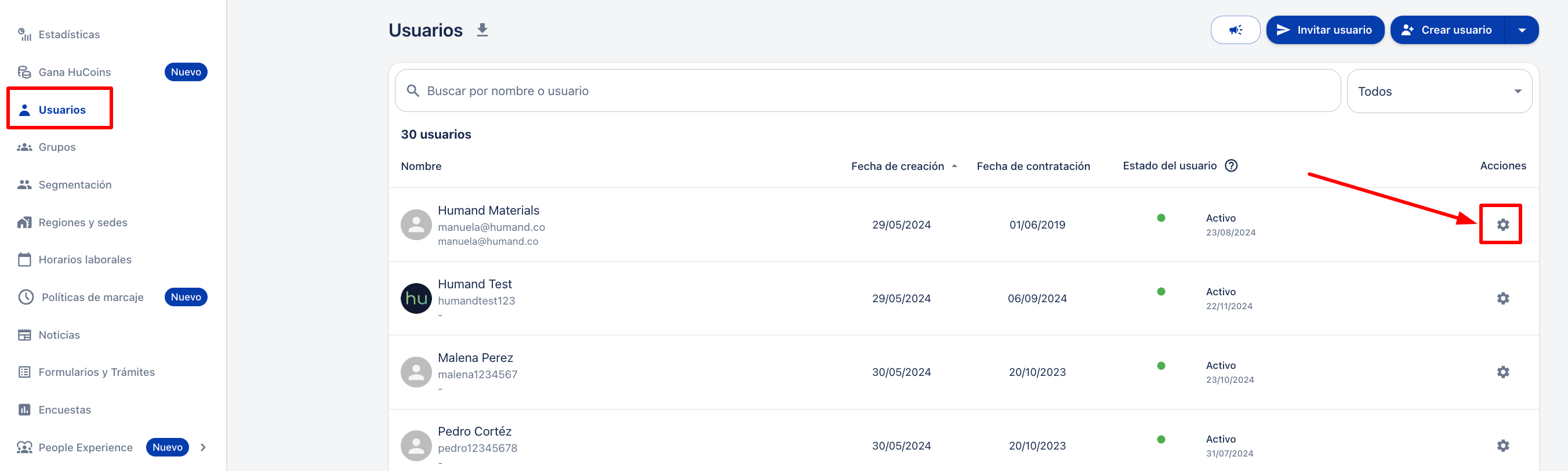 3. Намерете потребителя и кликнете върху настройките му ⚙️.