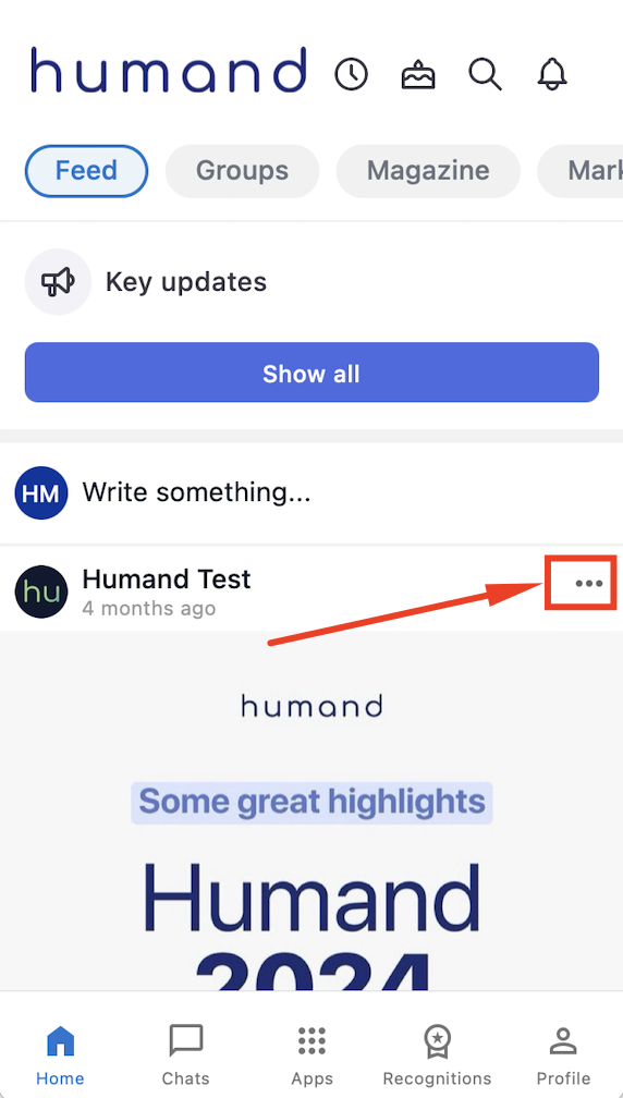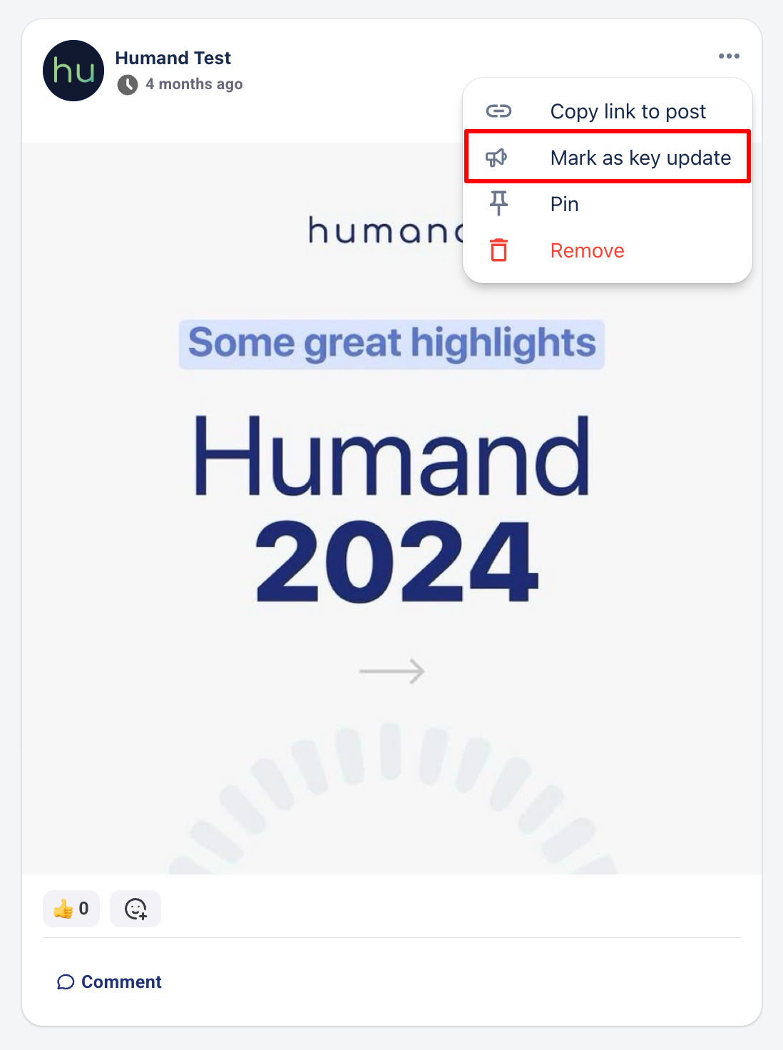 За да отбележите публикация като ключова актуализация, както от Humand Web на вашия компютър, така и от Humand App:
