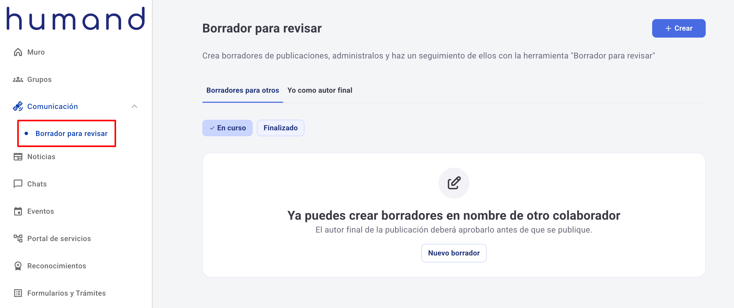 Потребителите с необходимите разрешения ще виждат секцията "Чернова за преглед" в "Комуникация" в приложението Humand.