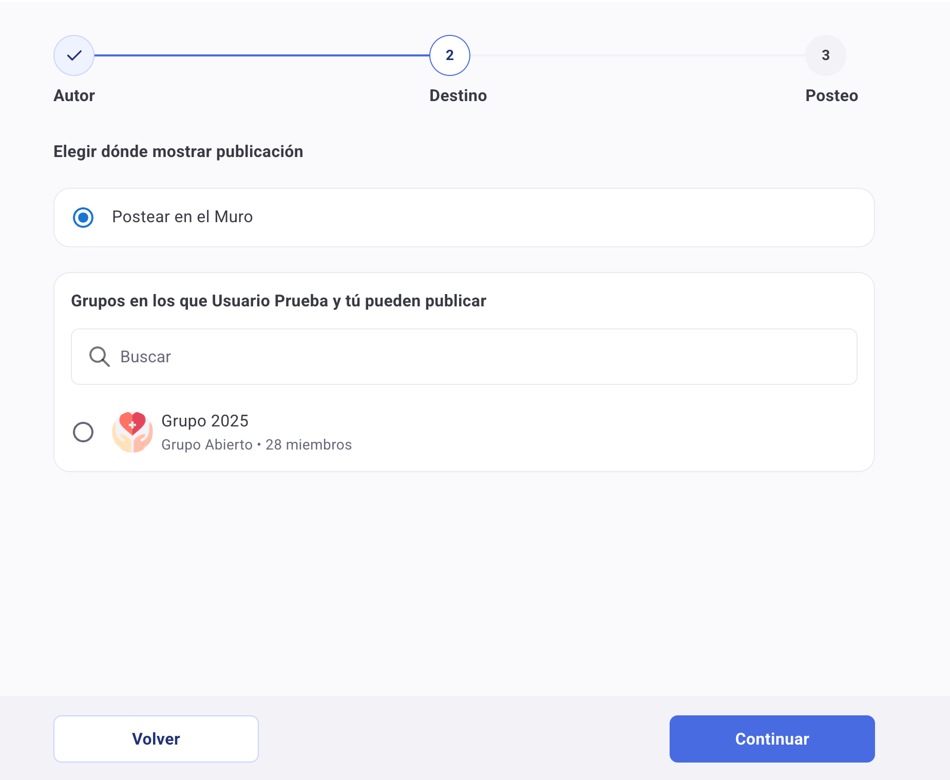 5. След това трябва да изберете къде ще се показва публикацията – може да е на стената на общността или в група, която споделяте с този потребител (опцията за публикуване на Стената ще е налична само ако крайният автор има разрешение “Създавай публикации на стената”).