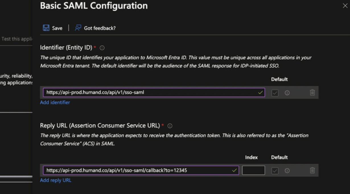 ANCE_IDReply URL (ACS) https://api-prod.humand.co/api/v1/backoffice/sso-saml/INSTANCE_ID
