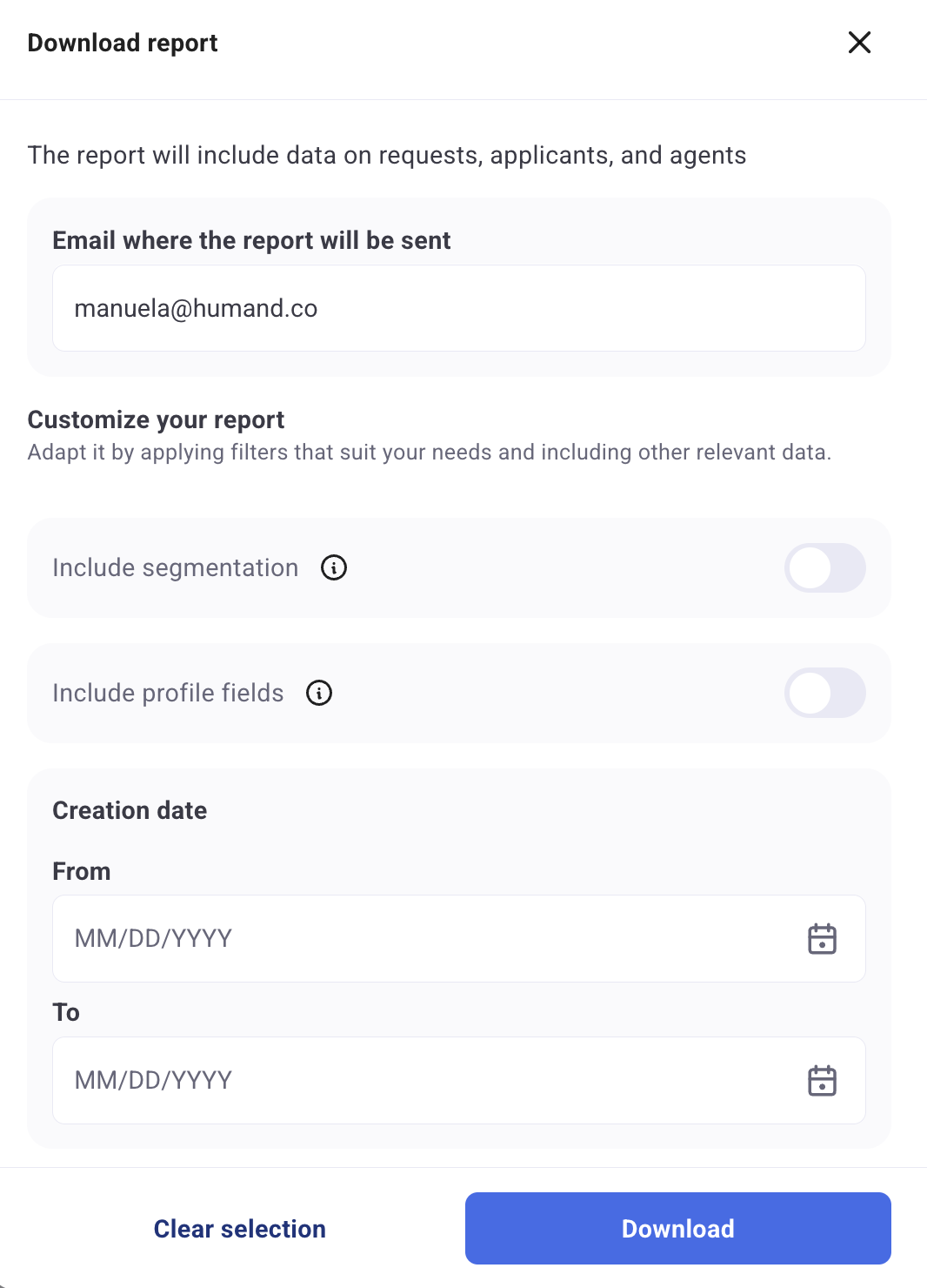 4. След това въведете имейла, на който ще бъде изпратен отчетът. Можете също да изберете полетата от профила на заявителя и сегментационните групи, които искате да включите, както и да филтрирате по дата на създаване на заявките.