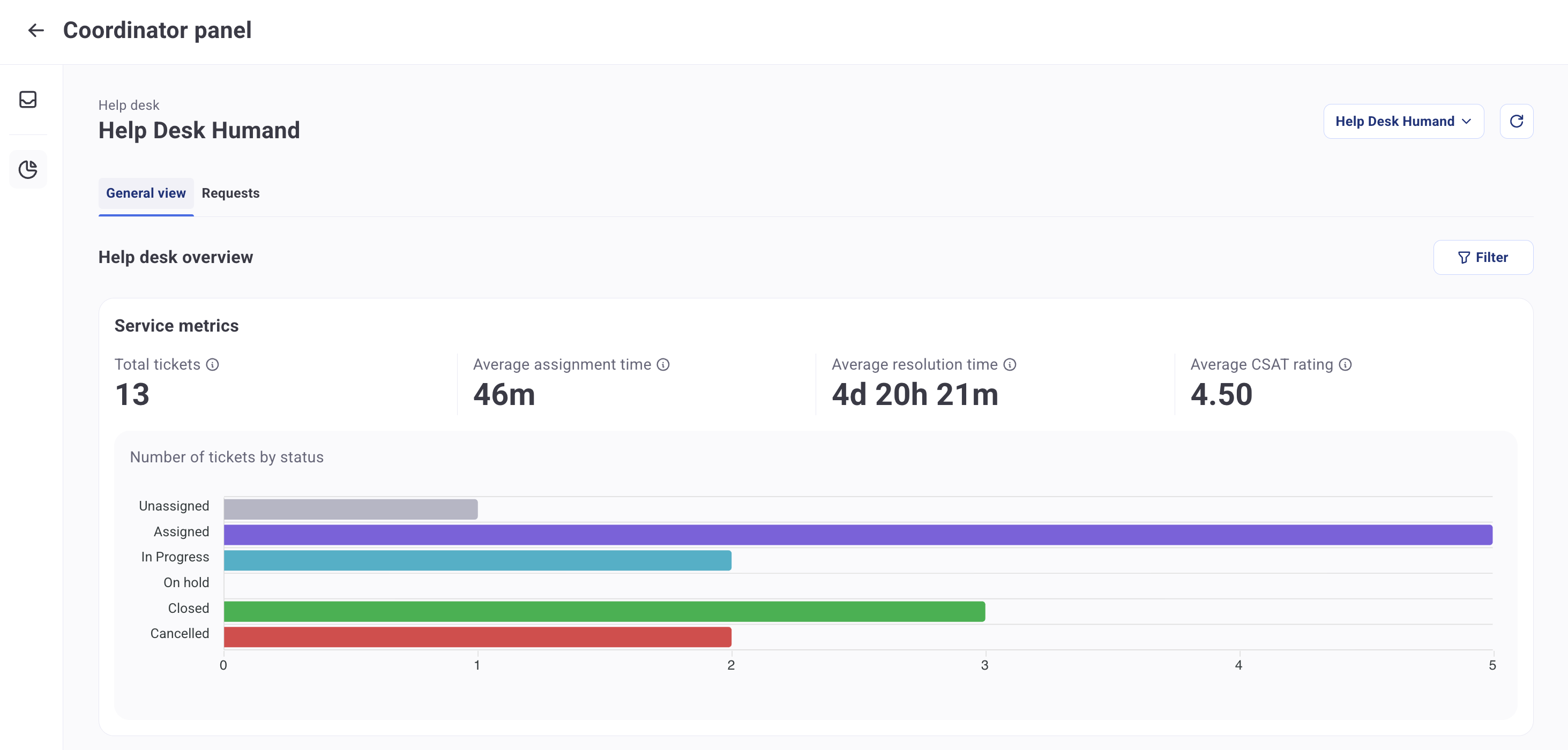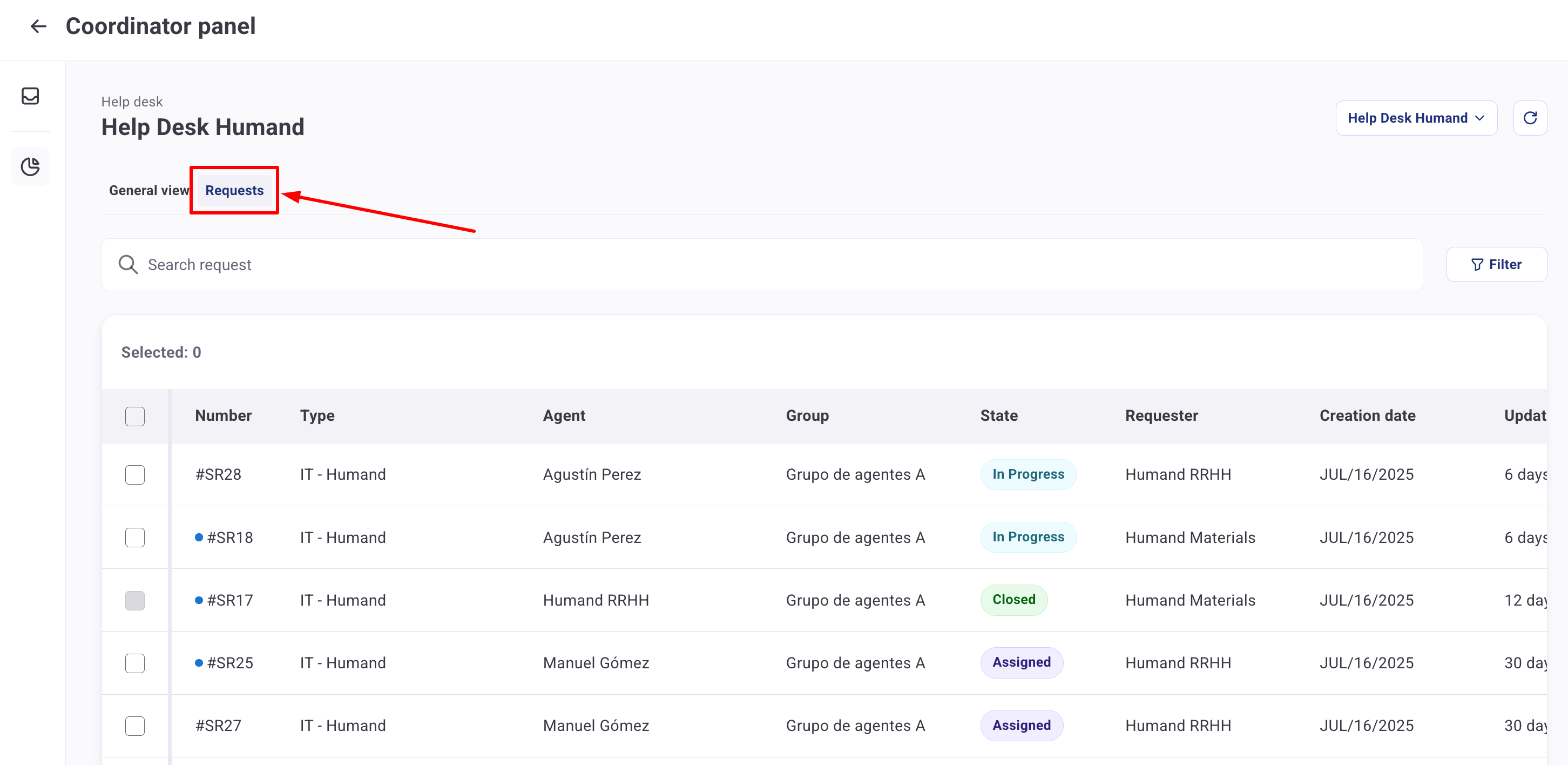 След като бъдете назначени като координатор на помощния център, потребителите ще могат да получат достъп до Панела на координатора, където могат да преглеждат и управляват чакащите заявки от агентите под тяхно наблюдение.