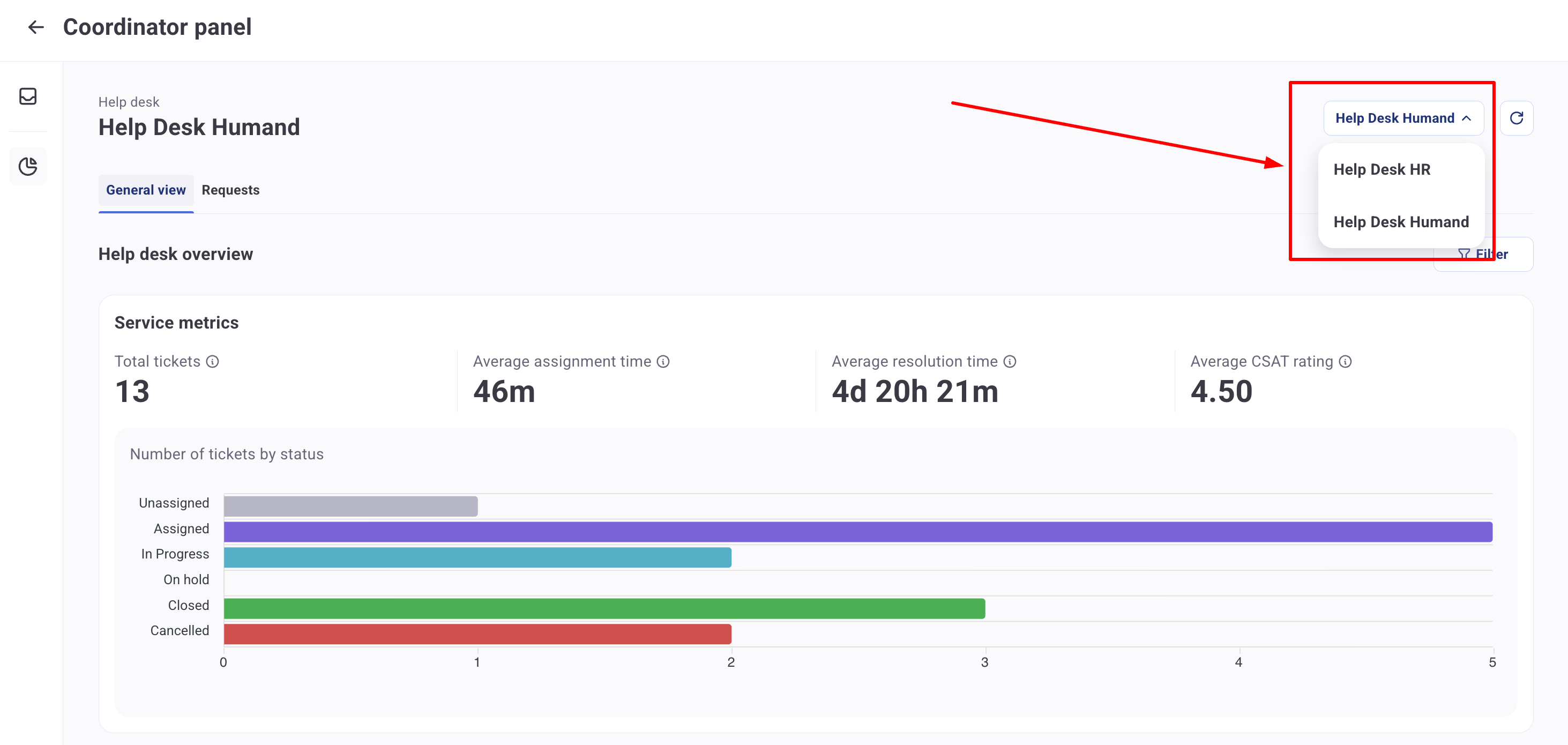 Ако сте координатор на повече от един помощен център, можете да избирате между различните центрове, за които искате да видите детайли и метрики.