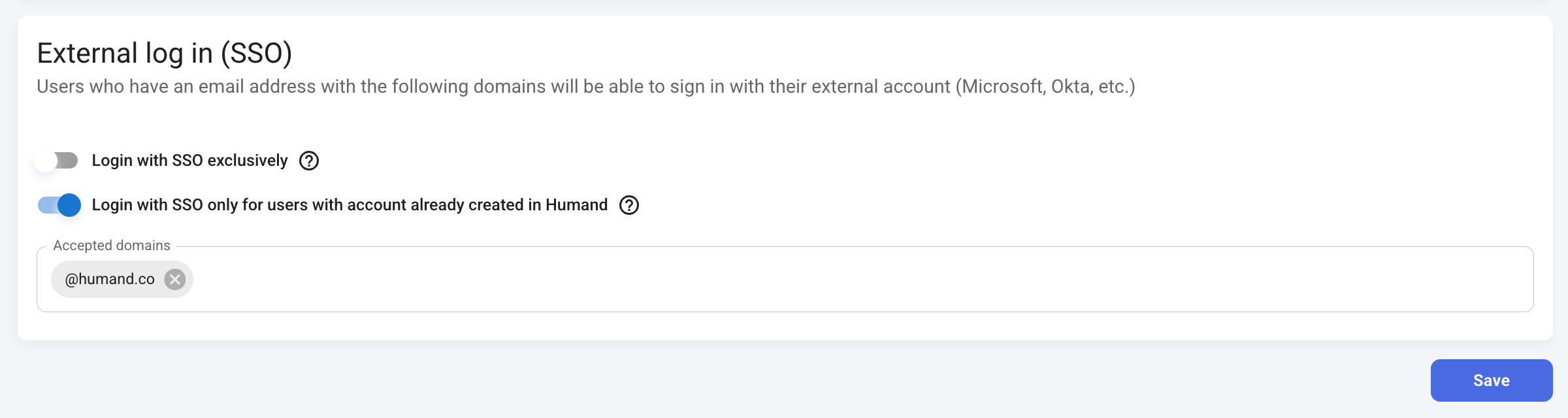 Освен това, преди да предоставите необходимите разрешения, първо трябва да активирате Външно влизане (SSO) от настройките на Humand. За да завършите този процес, можете да се обърнете към следната статия: 📚 Как да активирам Еднократна идентификация (SSO)?