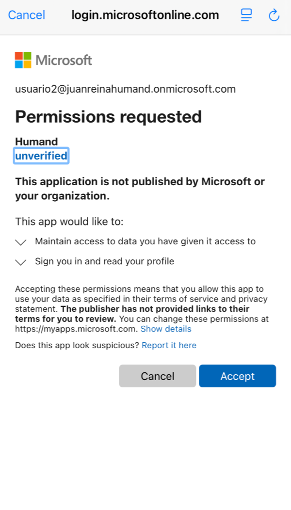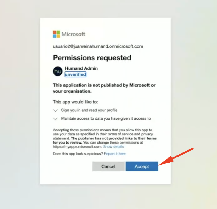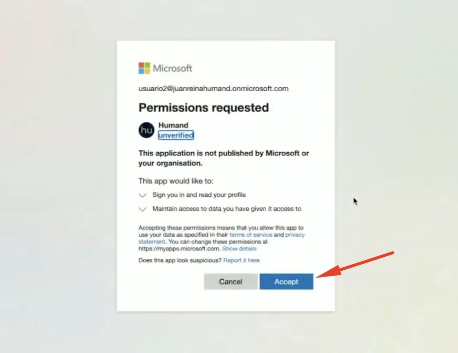 4. Натиснете "Приемам". Това ще разреши на Humand да интегрира влизането с вашата Microsoft среда. Това действие трябва да се извърши само веднъж.