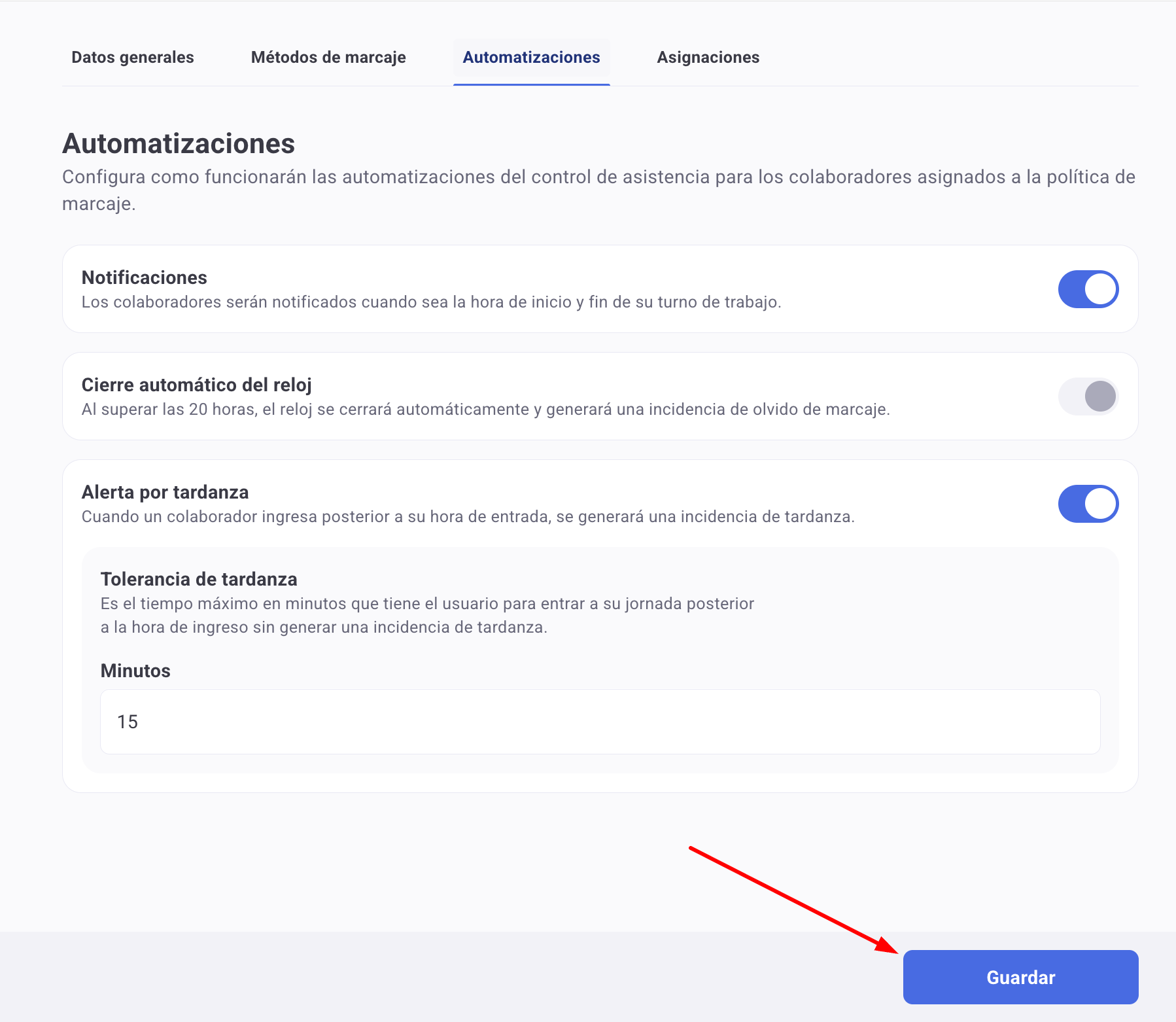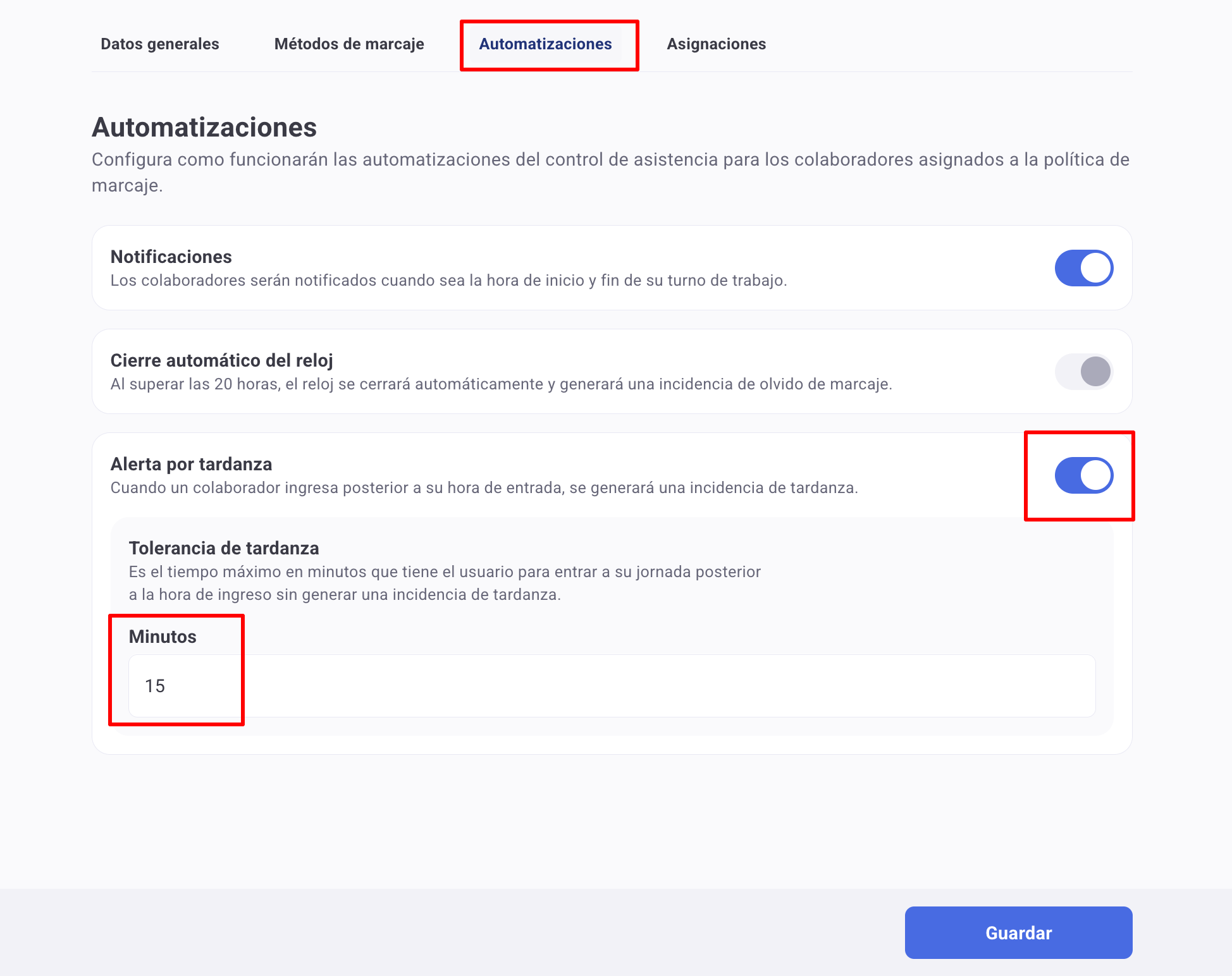 В настройките на политика за отчитане на присъствие можете да активирате или деактивирате автоматичното създаване на инциденти със закъснение и да определите толеранс в минути, така че потребителите да могат да се отбелязват без това да се отчита като закъснение.