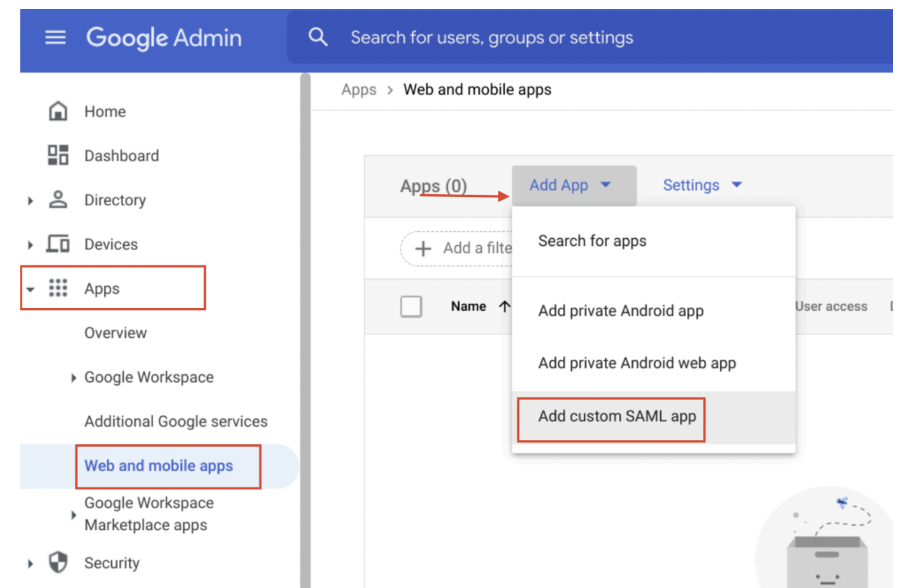 3. Кликнете Добавяне на приложение > Добавяне на персонализирано SAML приложение.