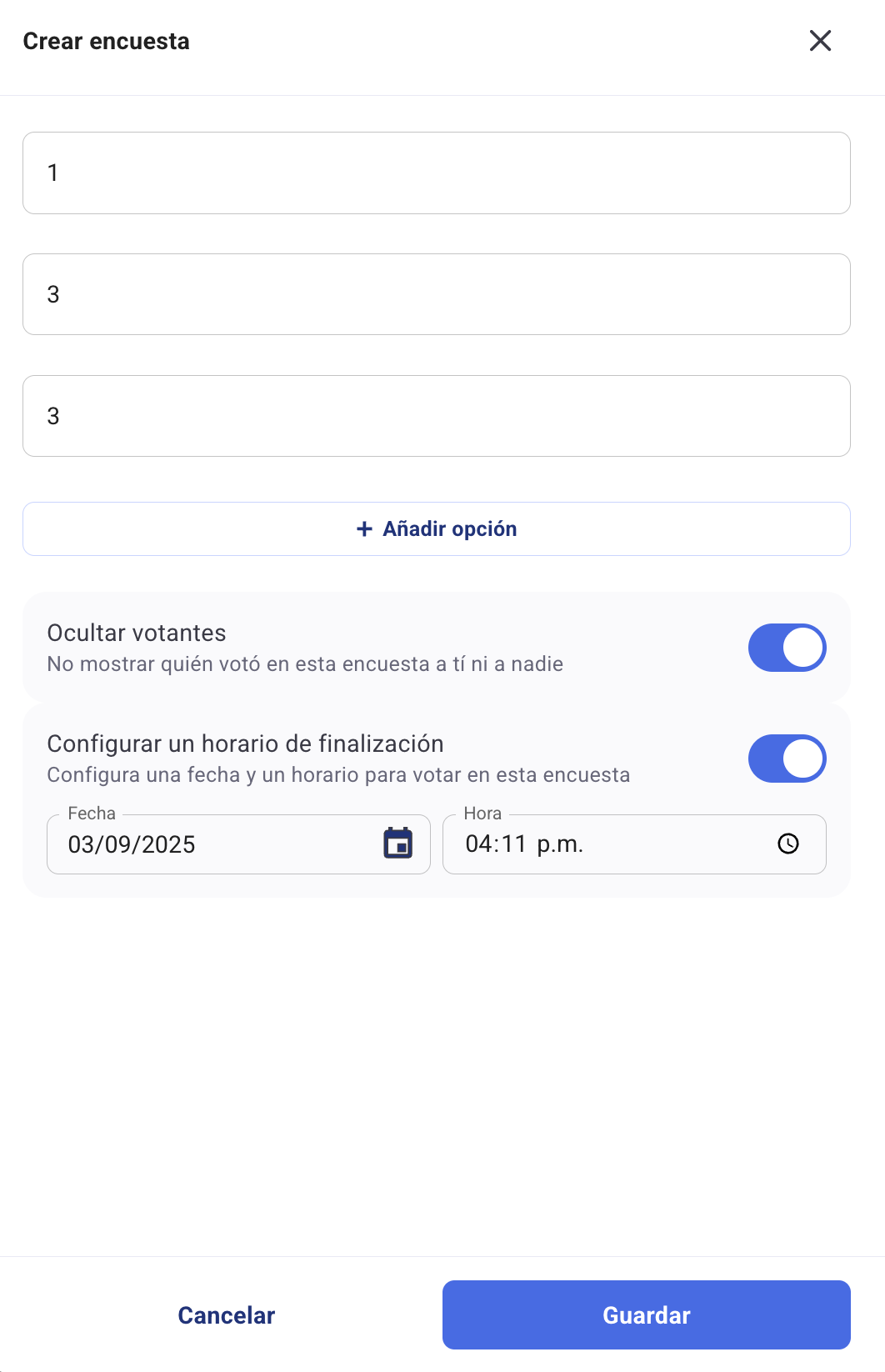 4. След това можете да добавите опциите, за които искате колегите да гласуват. Можете да изберете дали да скриете гласувалите или не, както и да зададете краен срок и час. След като добавите опциите, натиснете Запази.