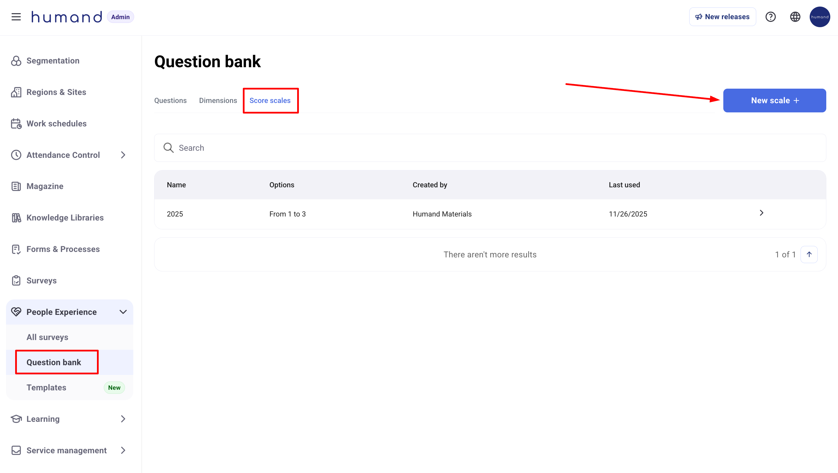 1. Влезете в някоя от споменатите по-горе опции, например в Банка на въпросите от Humand Admin. След това кликнете върху "Нова скала +".