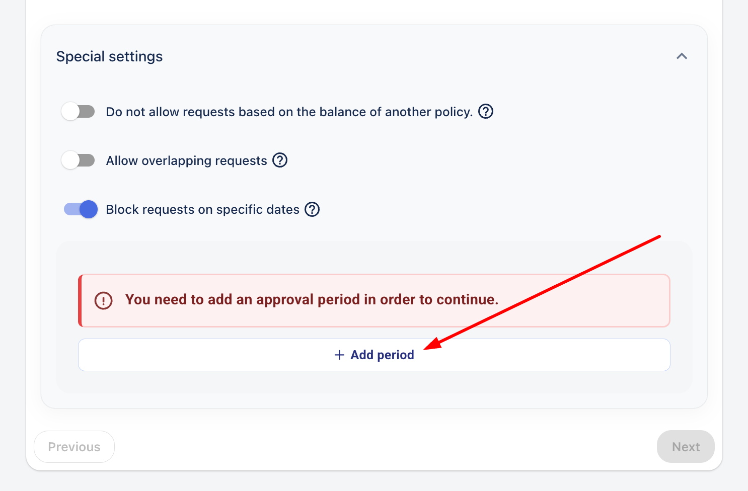За да блокирате конкретен период в рамките на политика за отпуск, следвайте стъпките по-долу: