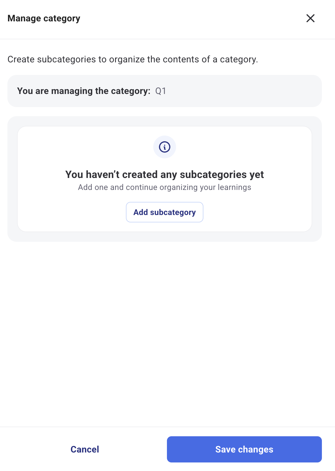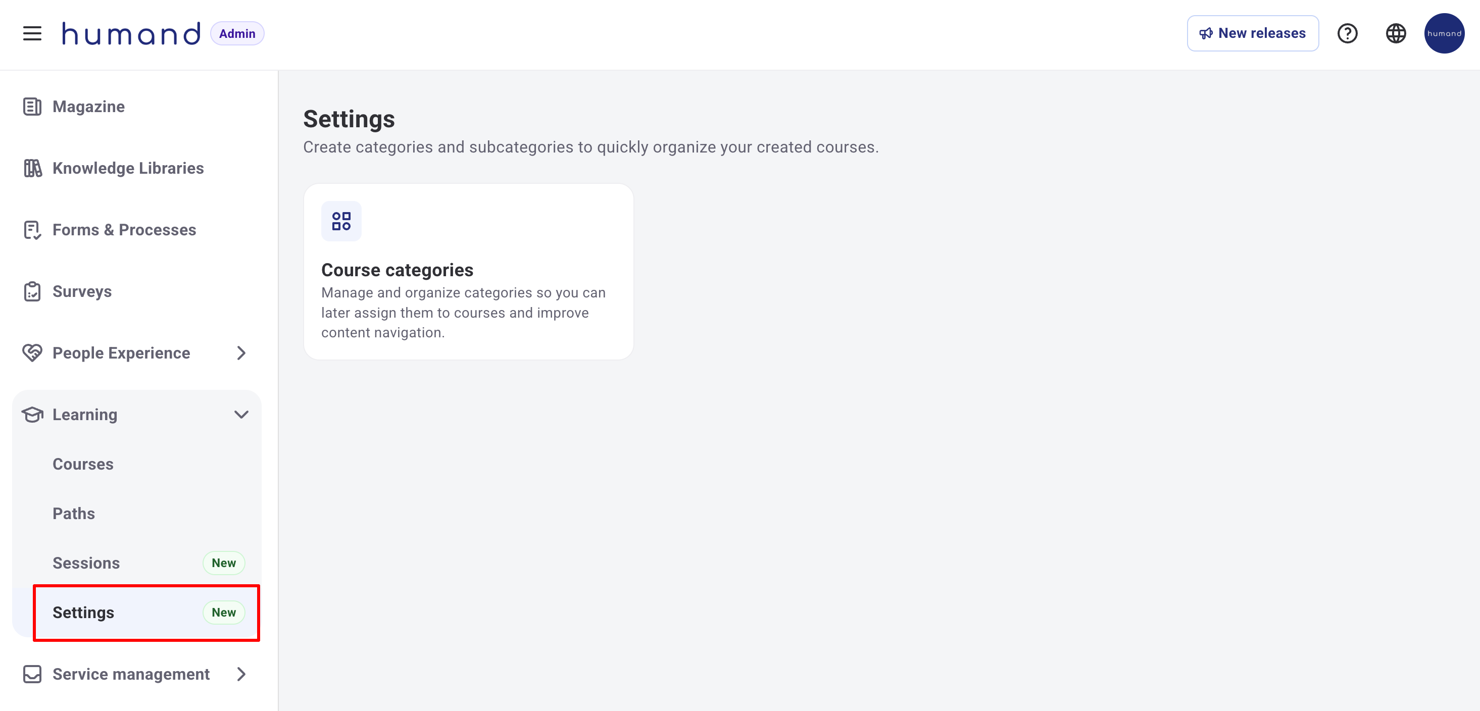 В модула Обучение ще намерите секцията „Настройки“, където можете да управлявате съществуващите категории и да създавате до две нива на подкатегории. Тези категории и подкатегории могат да се присвояват към курсове, за да ги организирате по-лесно и да улесните потребителите при намирането на съдържание чрез филтриране по тези опции.