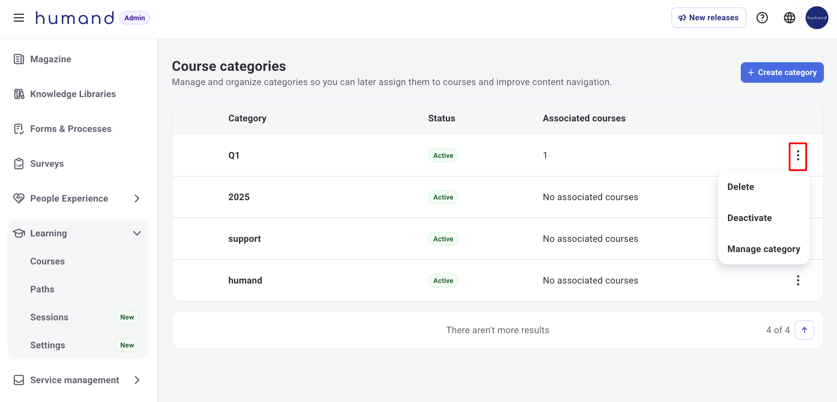 3. Вътре ще видите списък с всички създадени категории, техния статус и курсовете, свързани с тях. Оттук можете да изтривате, деактивирате или управлявате категориите.