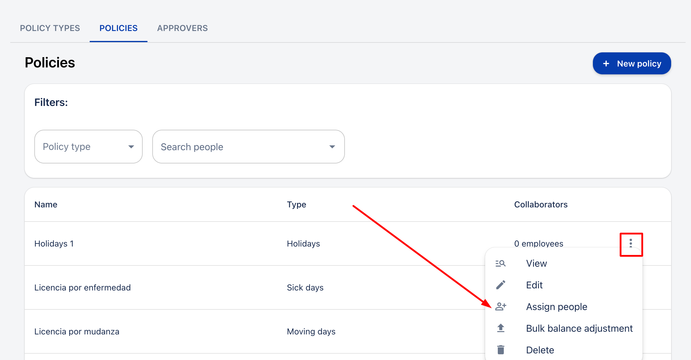 Depending on the settings you make in the policy, the days will be granted to the the collaborators you assign at the time or you must make a manual balance adjustment if they have already been granted.