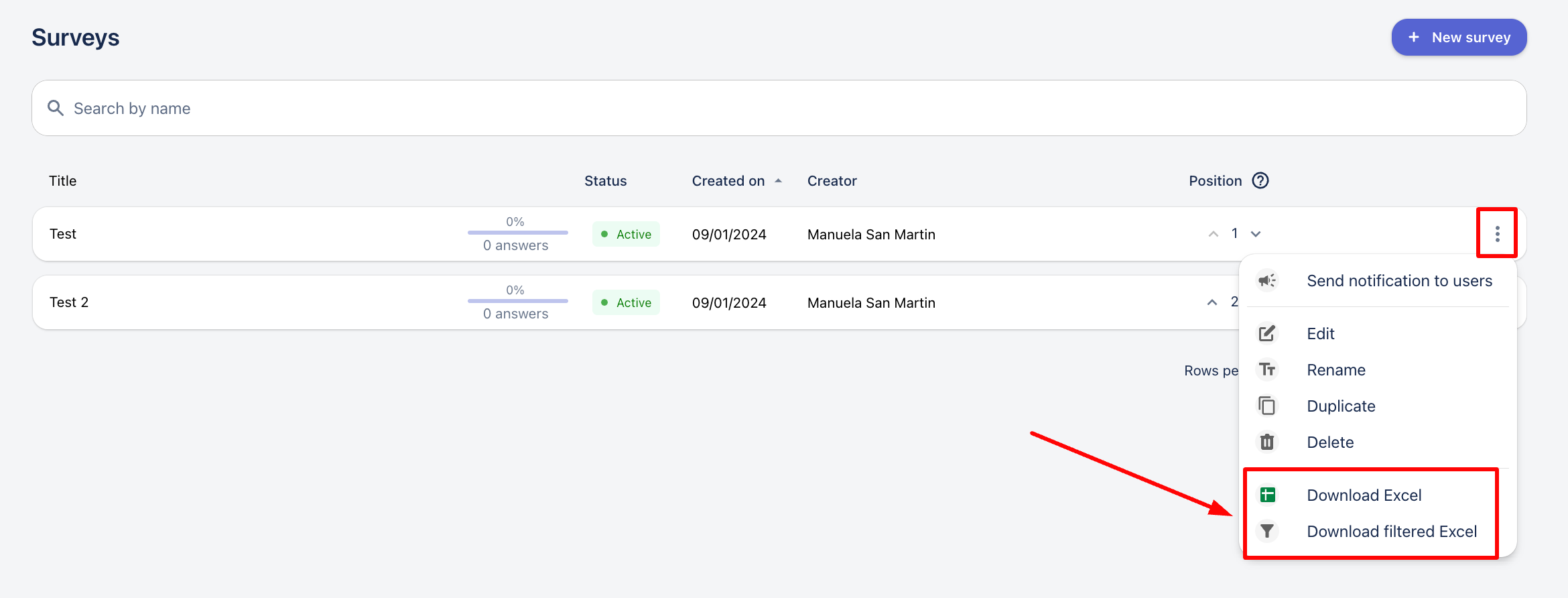 3. Click on the three dots of the selected survey and there you will be able to choose to download: