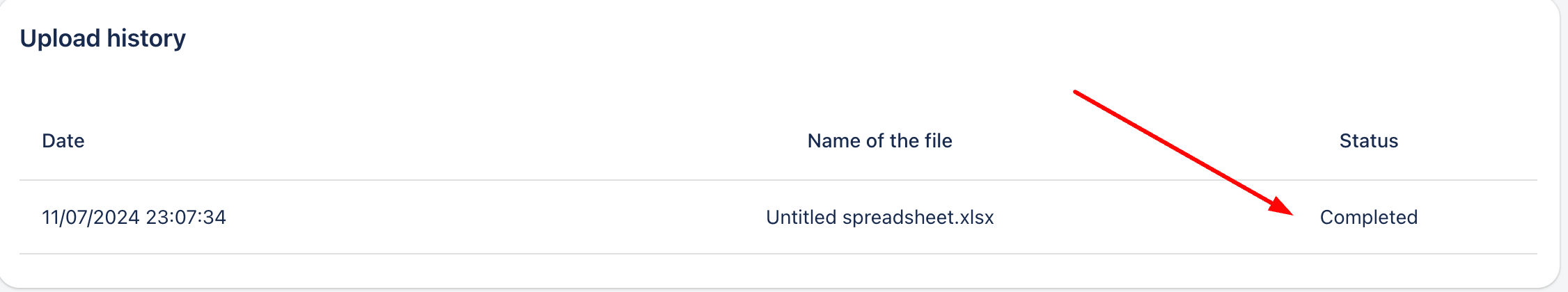 After uploading, you can see the Status column to check if the data upload was successful: