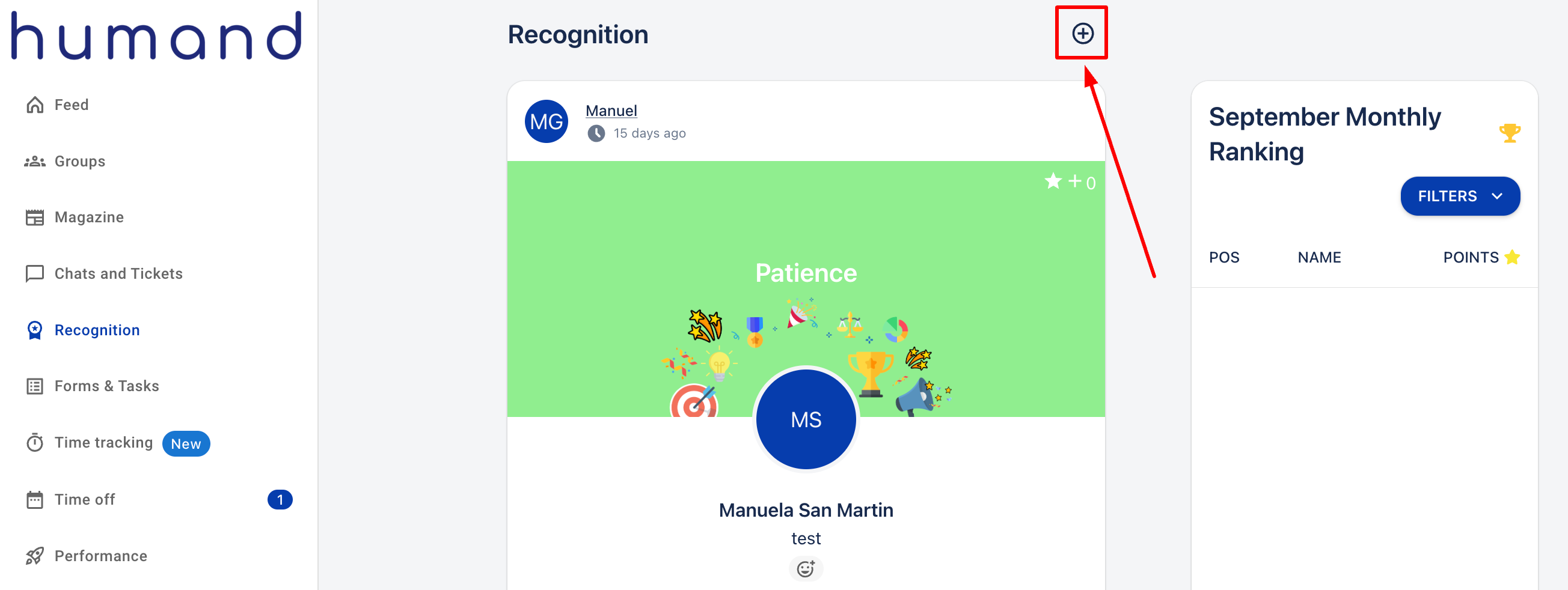 1. Go to the “Recognition” section and click on the “+” button.