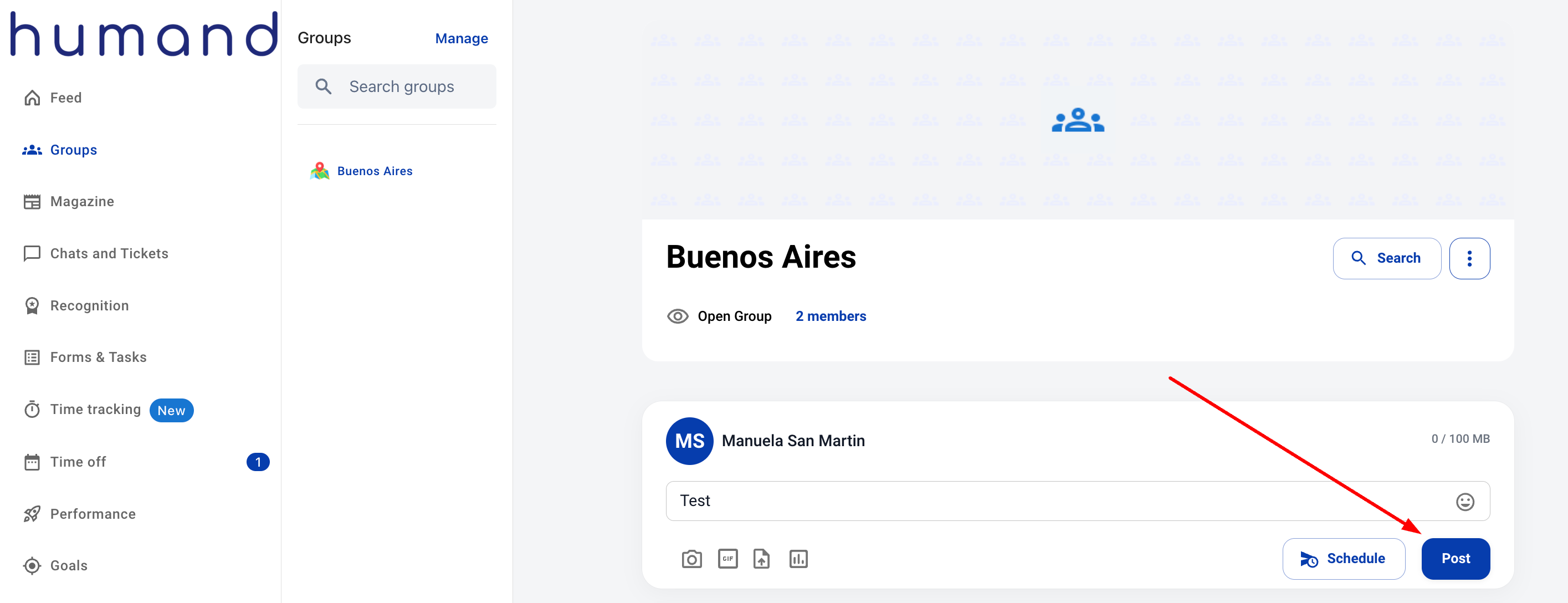 If you have the permissions to post, from the group in question you can: