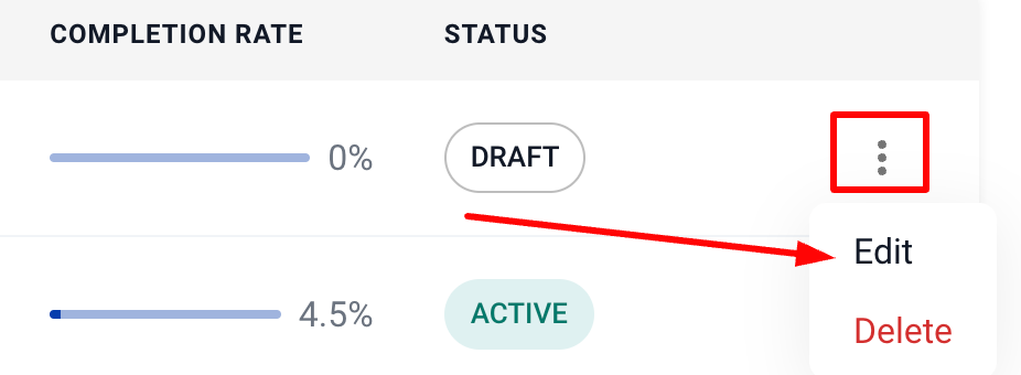 To edit an experience survey you have to select the survey you wish to modify, click on the three dots button (⦙) and go to Edit.