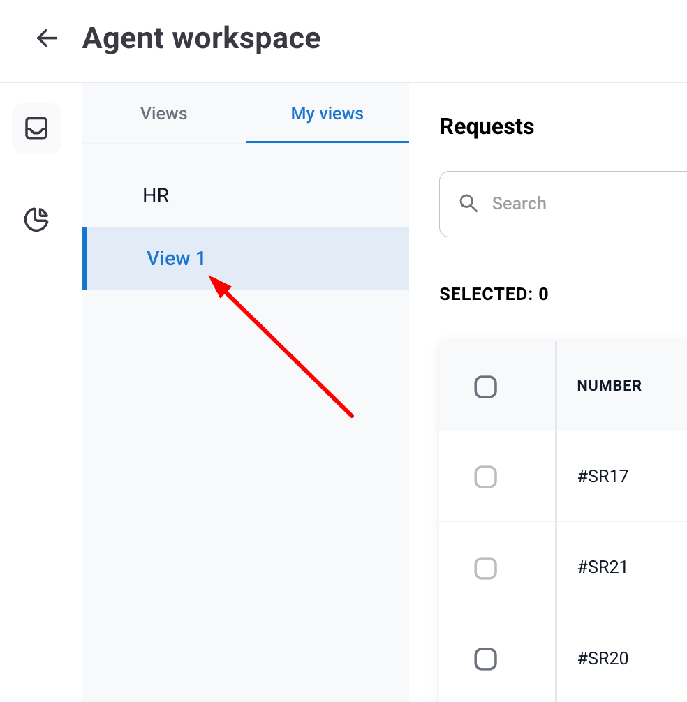 Within the Agent Panel, you can create, save, and manage custom views based on filters applied to the current table (initially requests). Agents can quickly access the resulting list from the “My Views” tab. To create a new view, follow the steps below: