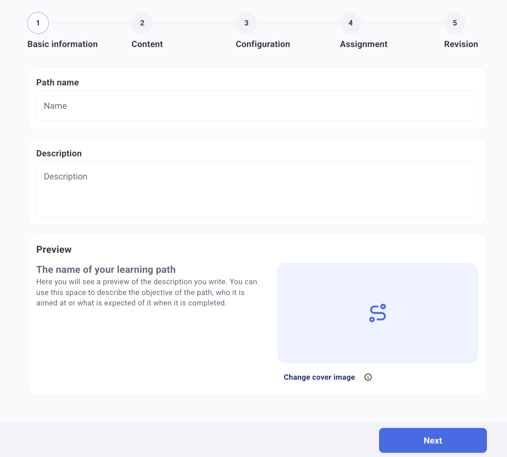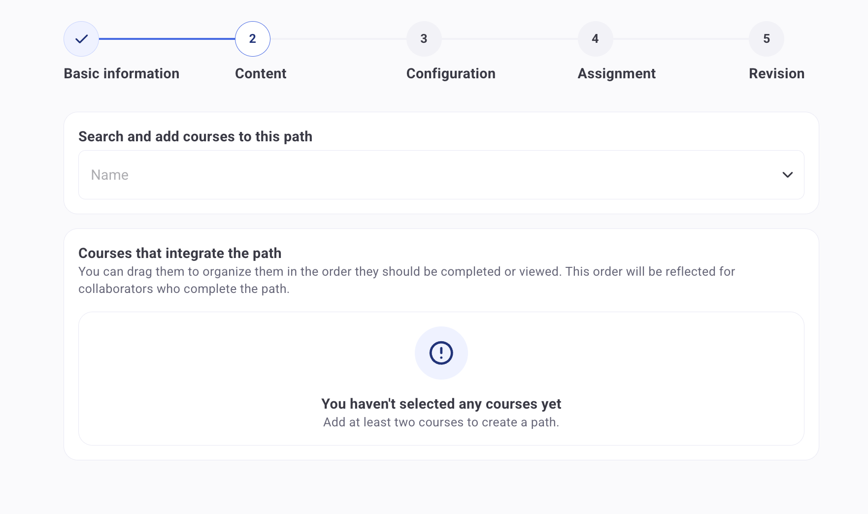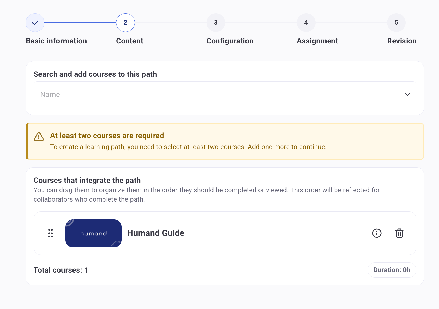 - Cover (optional) → If you don't upload one, a Humand cover will be used by default.The second step is to select the content (courses) that will be included in the path. To select a course, you need to search for it by name. All courses that already exist in Humand and are in Active status will appear there.
