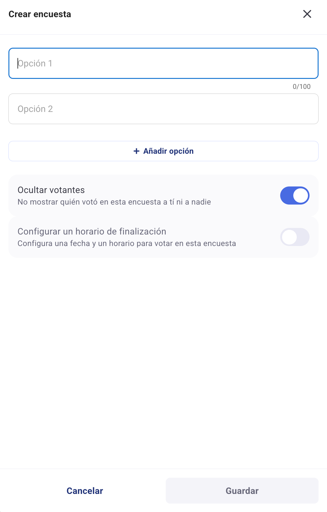 4. Once inside, you can add the options you want for collaborators to vote on. You can choose to hide the voters or not, and set a deadline date and time. After adding the options, click Save.